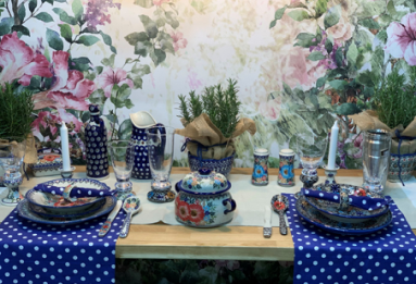 Nasze stoisko ceramiki bolesławieckiej zaprojektowane zostało pod hasłem "elegancki piknik", stąd zastosowano naturalne materiały: kwiaty, trawa, drewno, ceramika, naturalne rośliny.