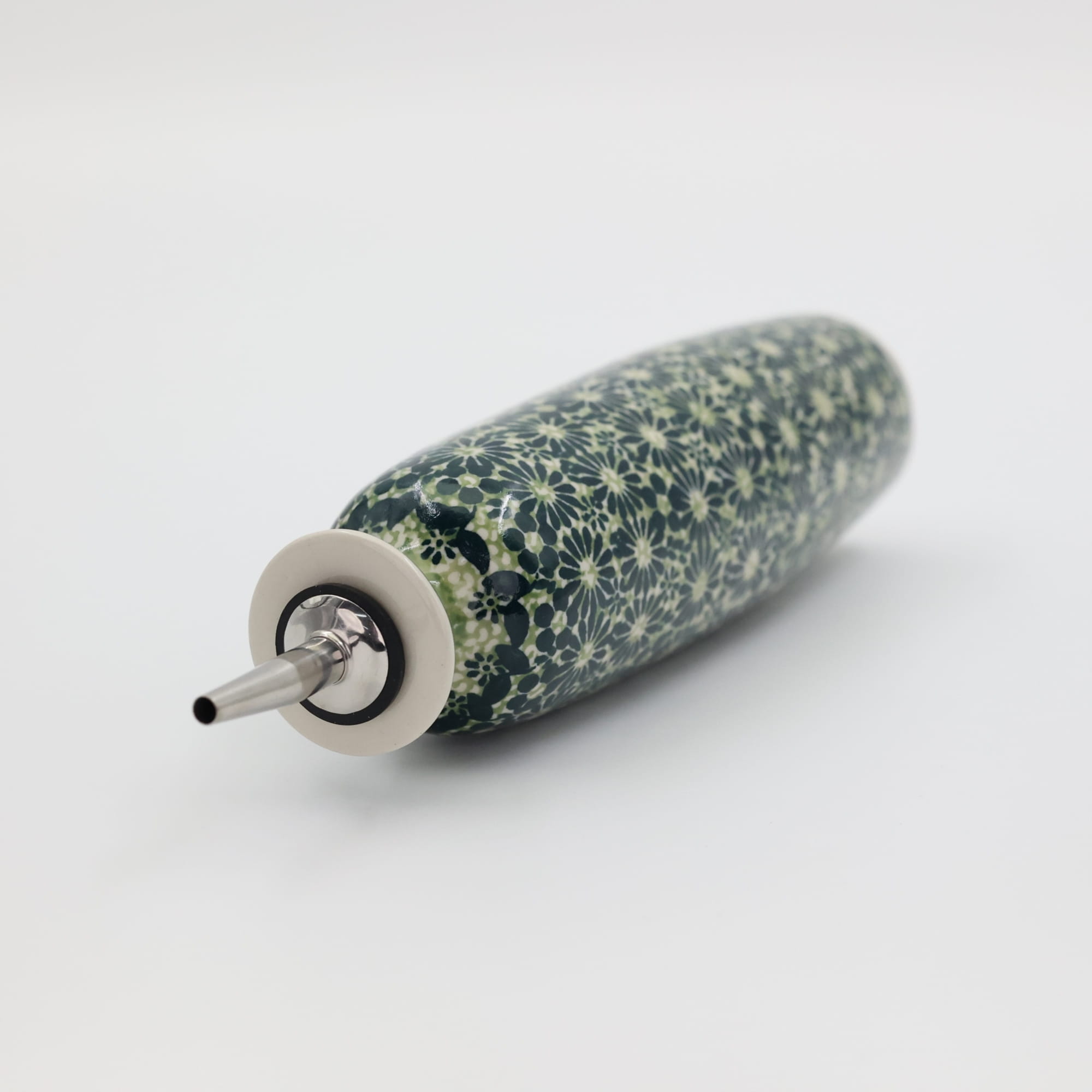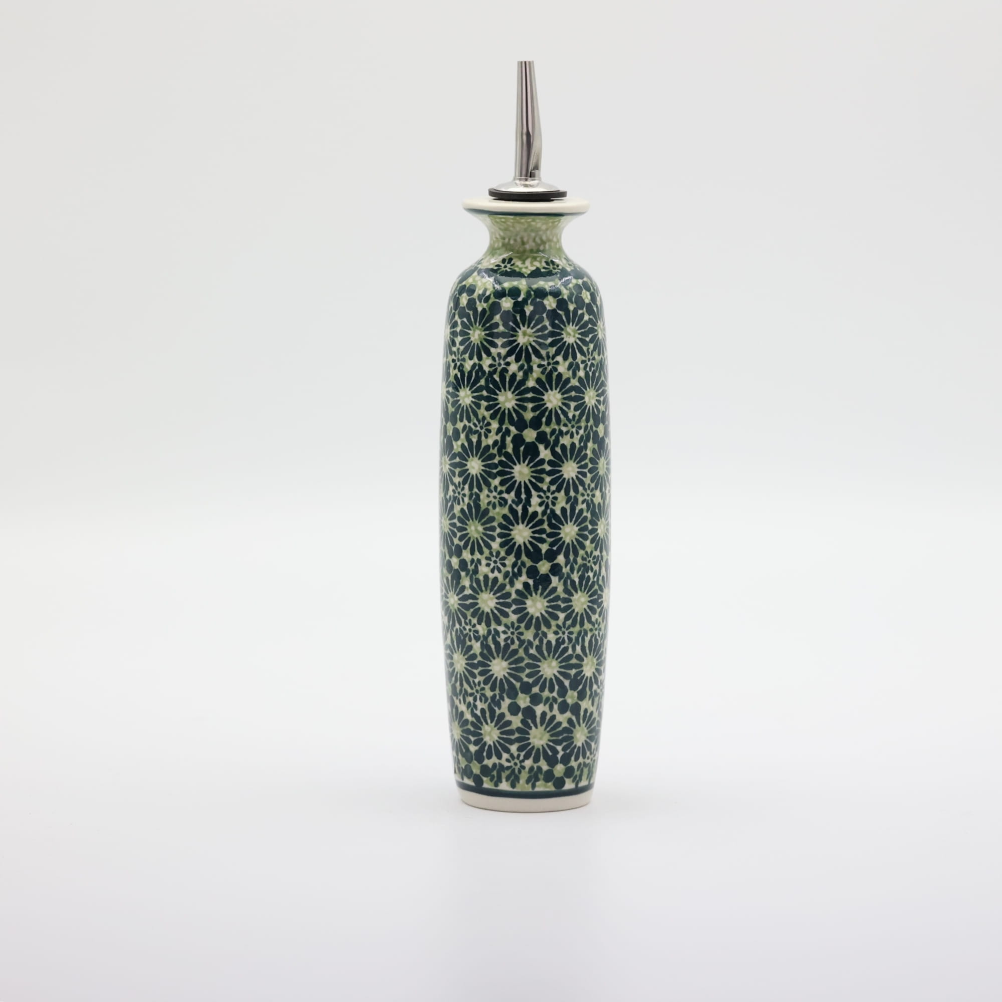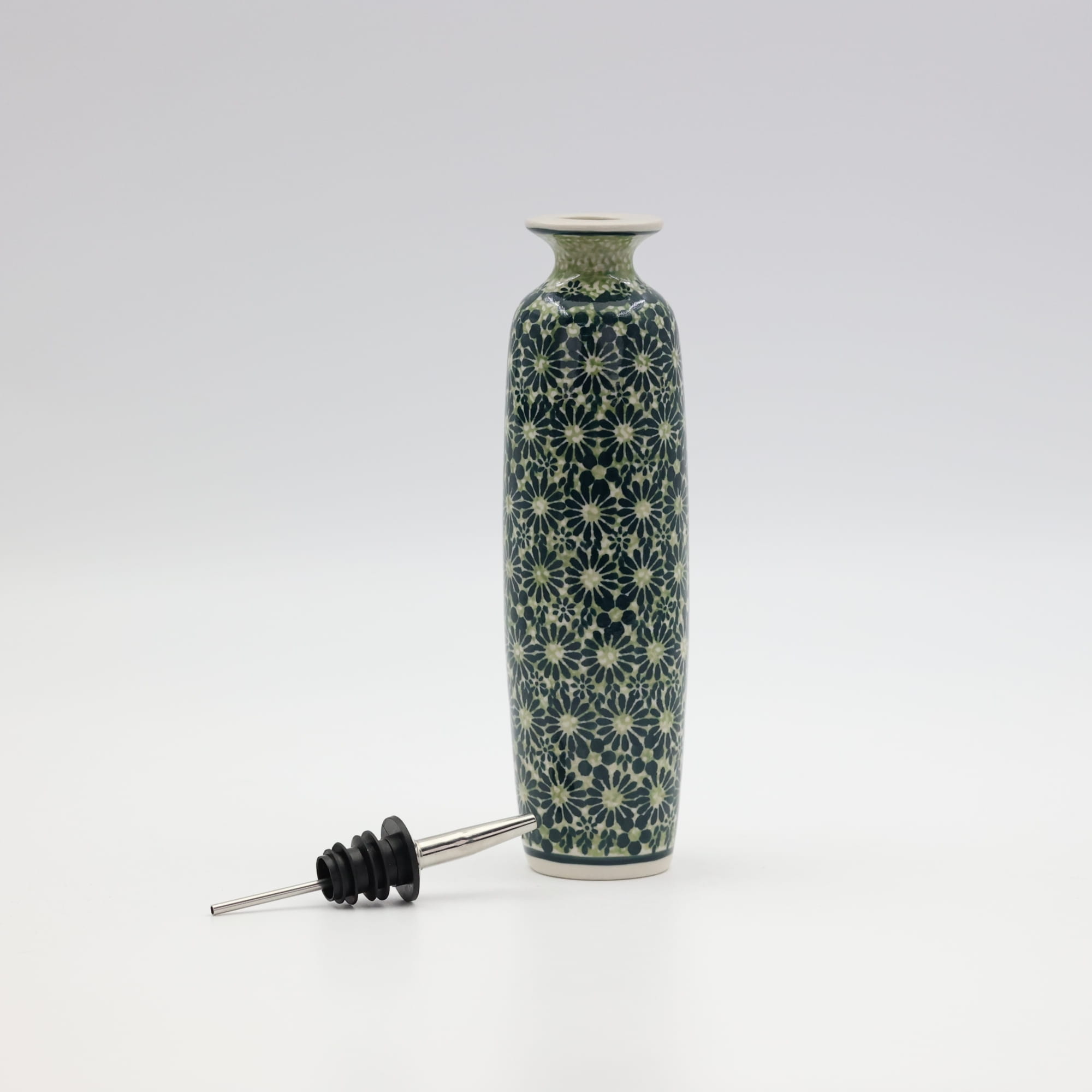 Butelka ceramiczna na oliwę o pojemności 450 ml. Bolesławiecka butelka okrągła z nalewakiem (dozownikiem).