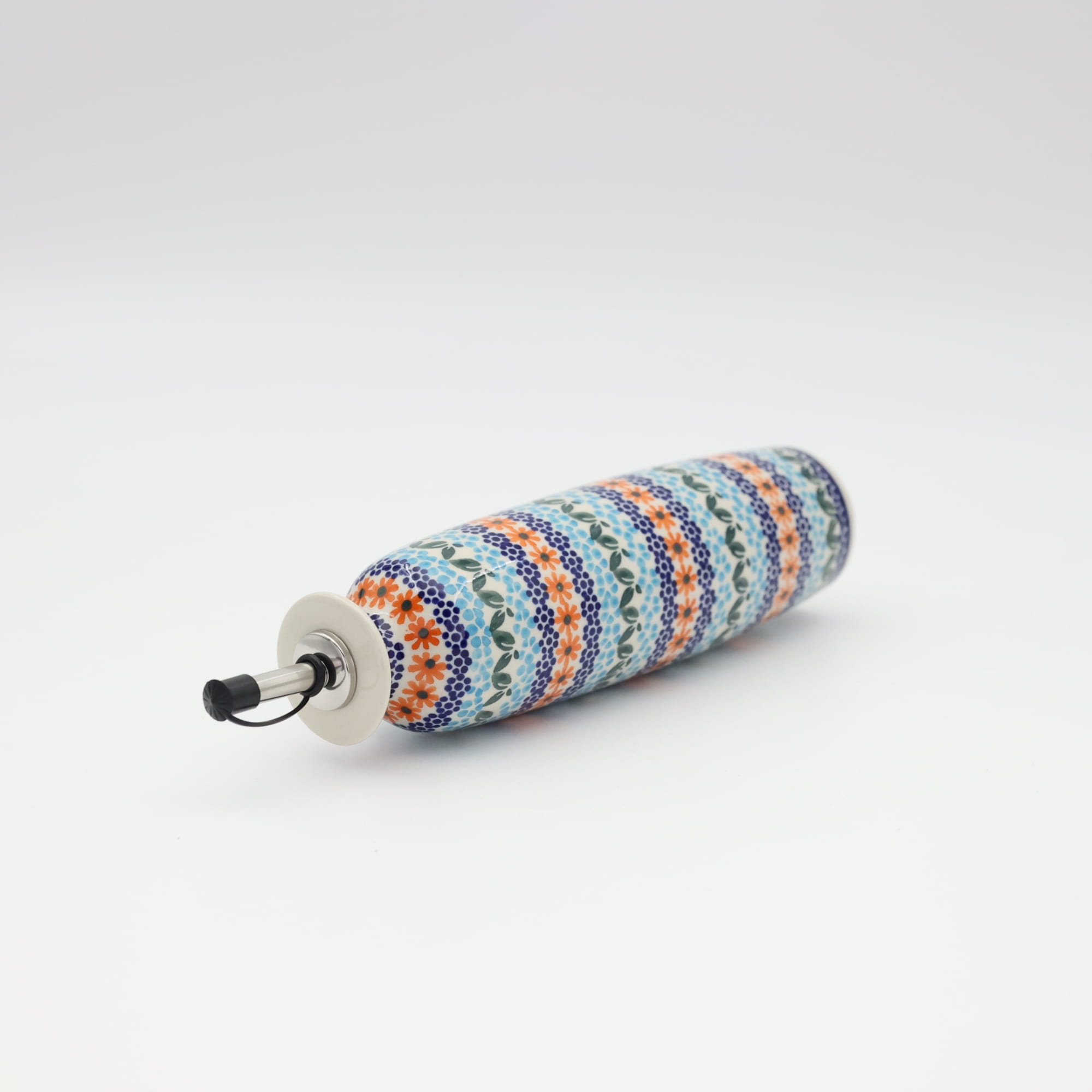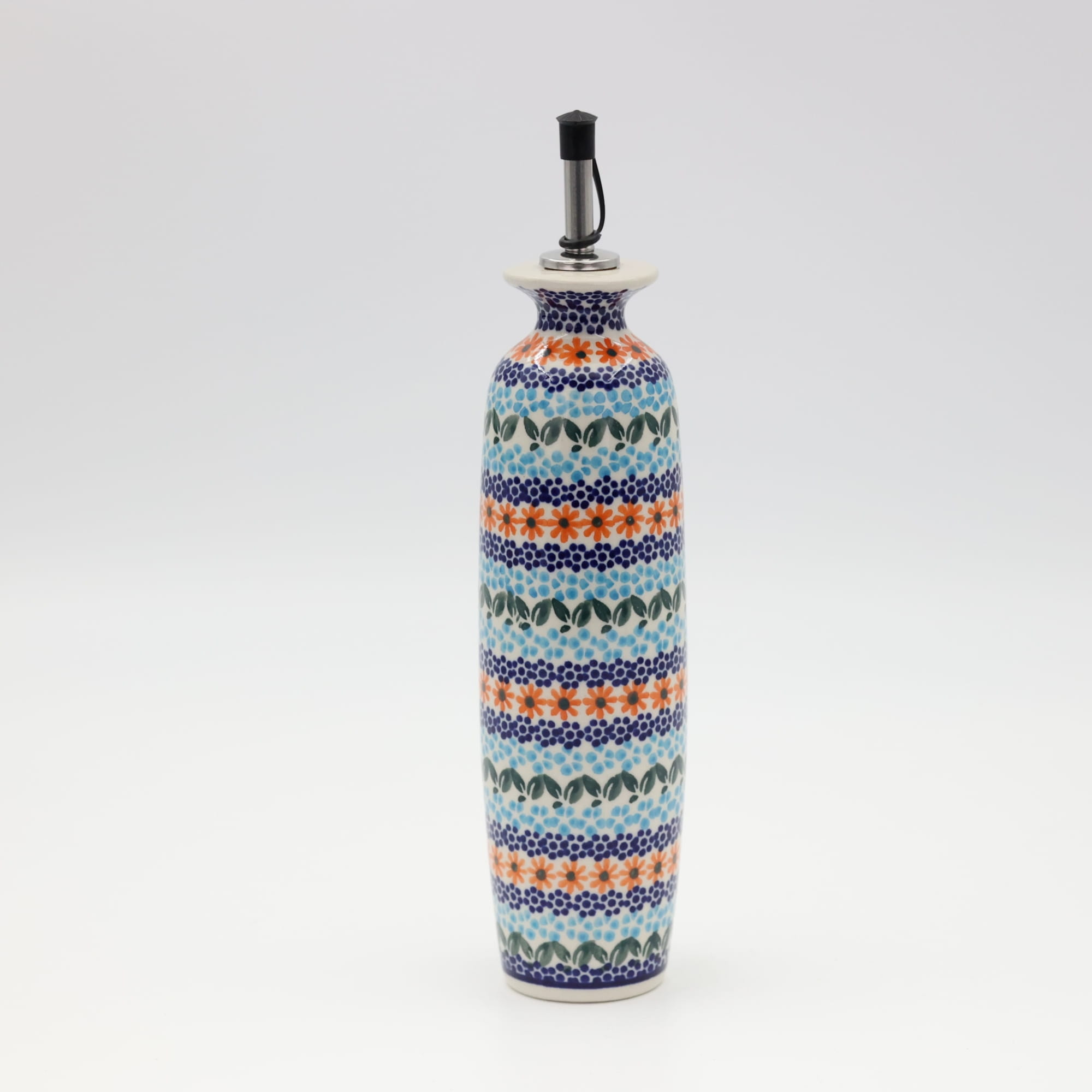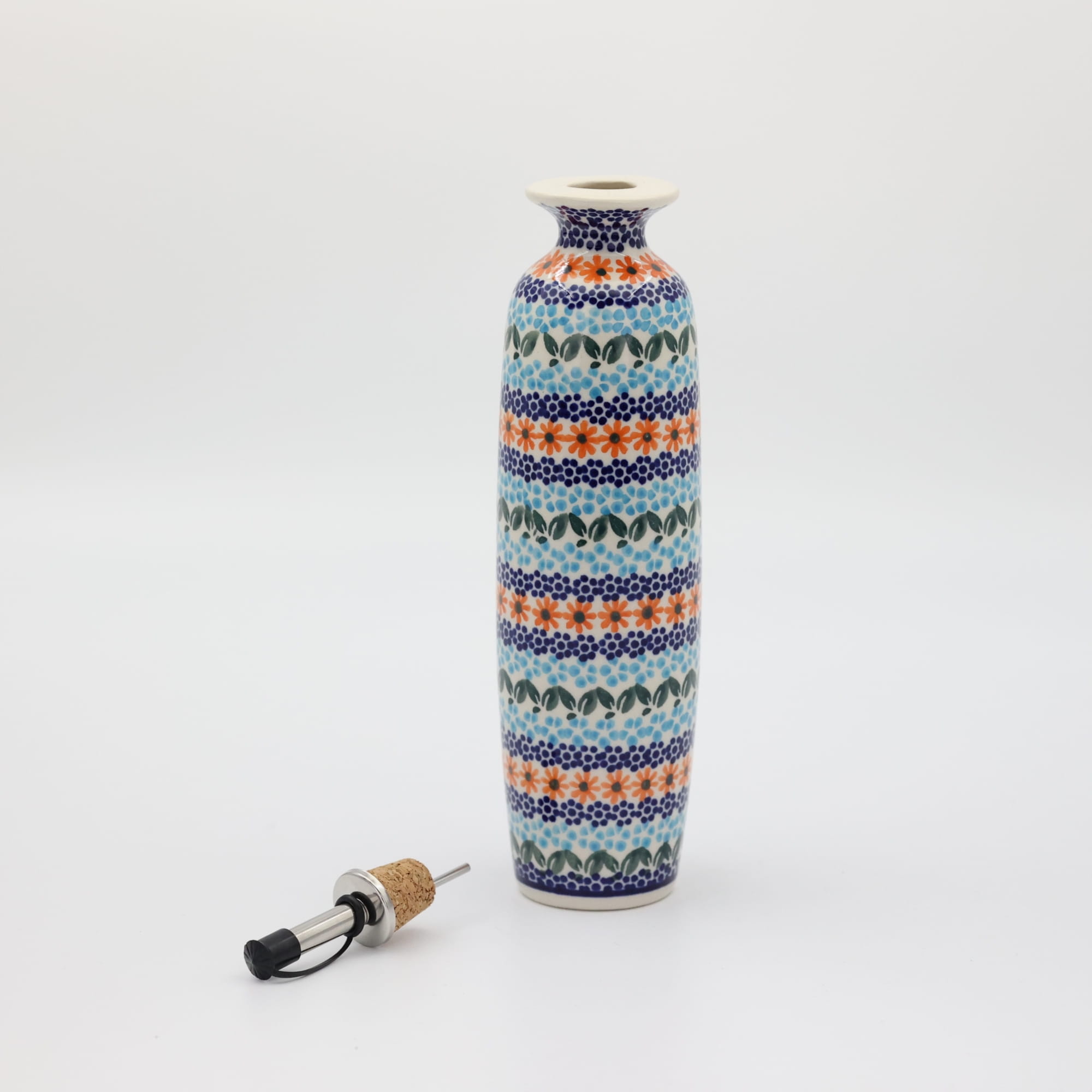 Butelka ceramiczna na oliwę o pojemności 450 ml. Bolesławiecka butelka okrągła z nalewakiem (dozownikiem).