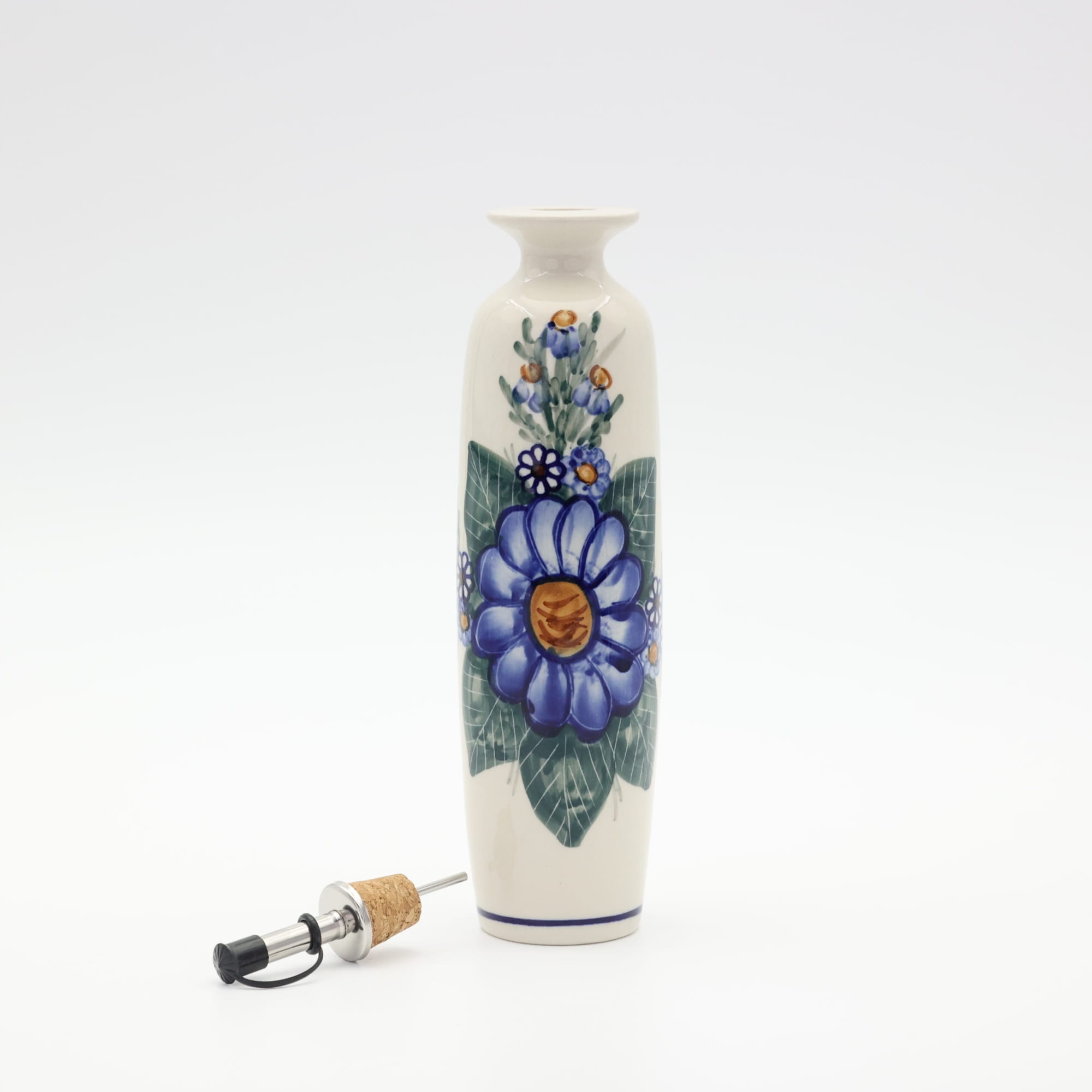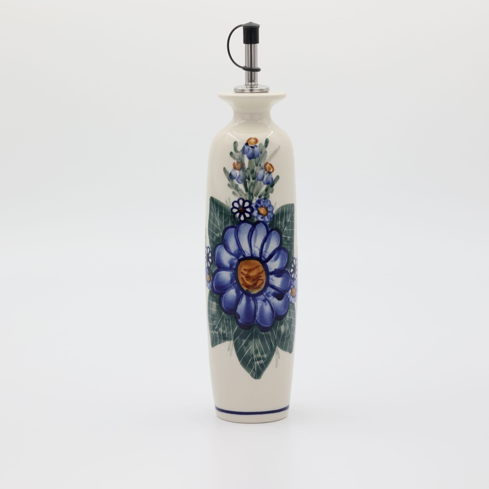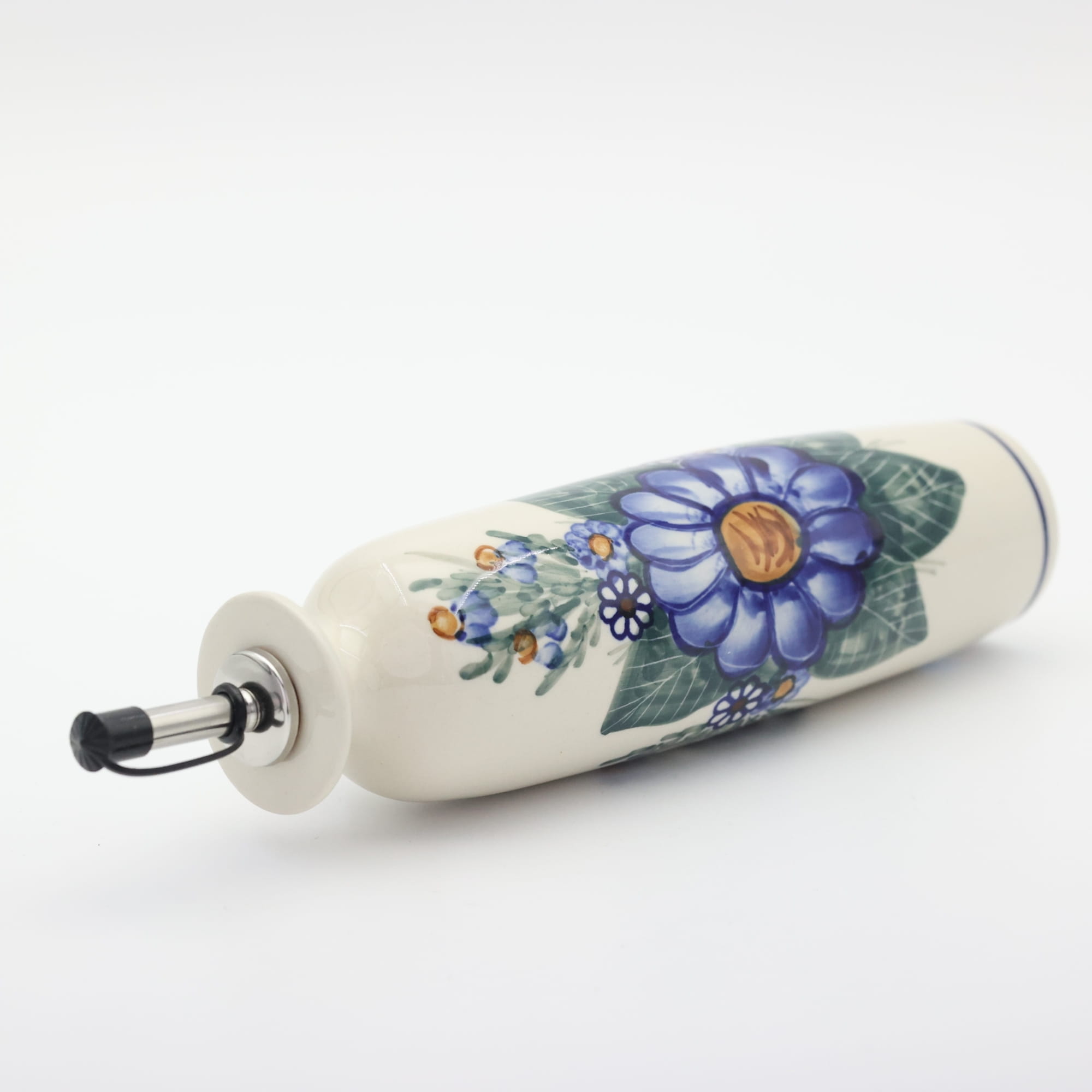 Butelka ceramiczna na oliwę o pojemności 450 ml. Bolesławiecka butelka okrągła z nalewakiem (dozownikiem).