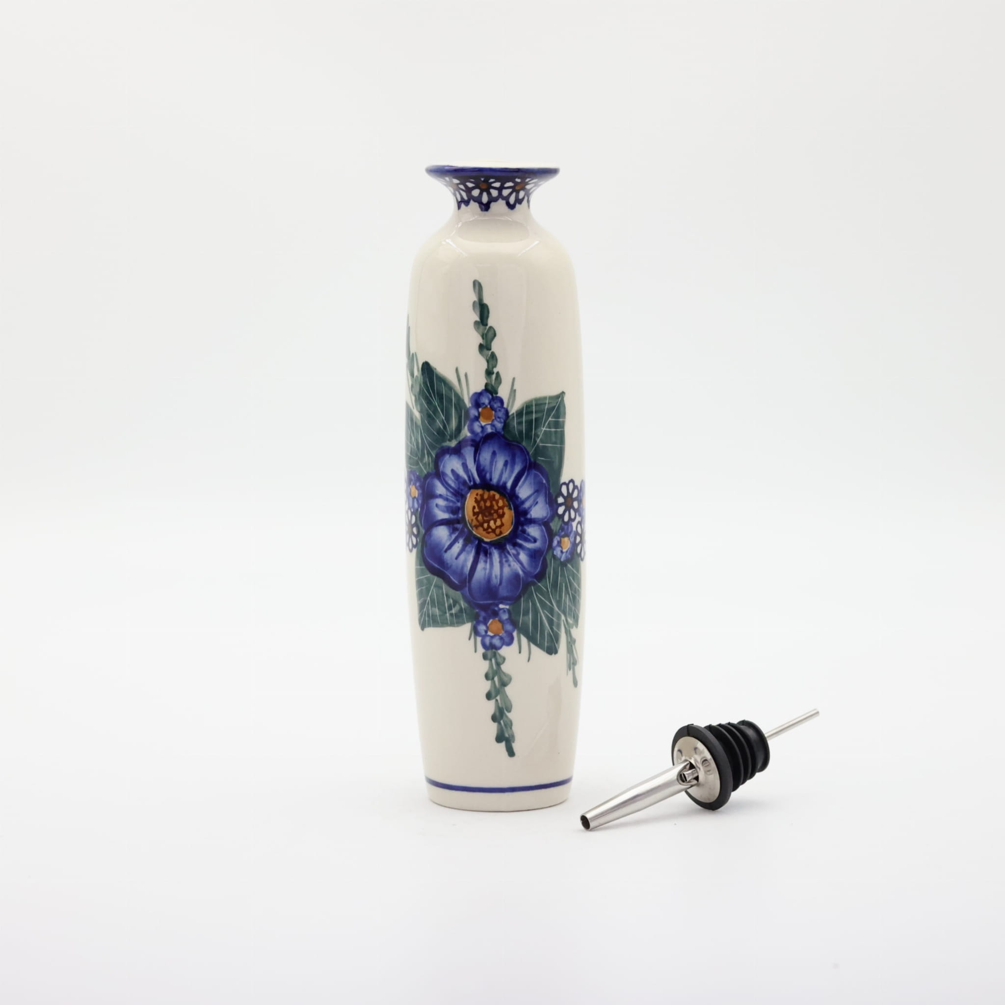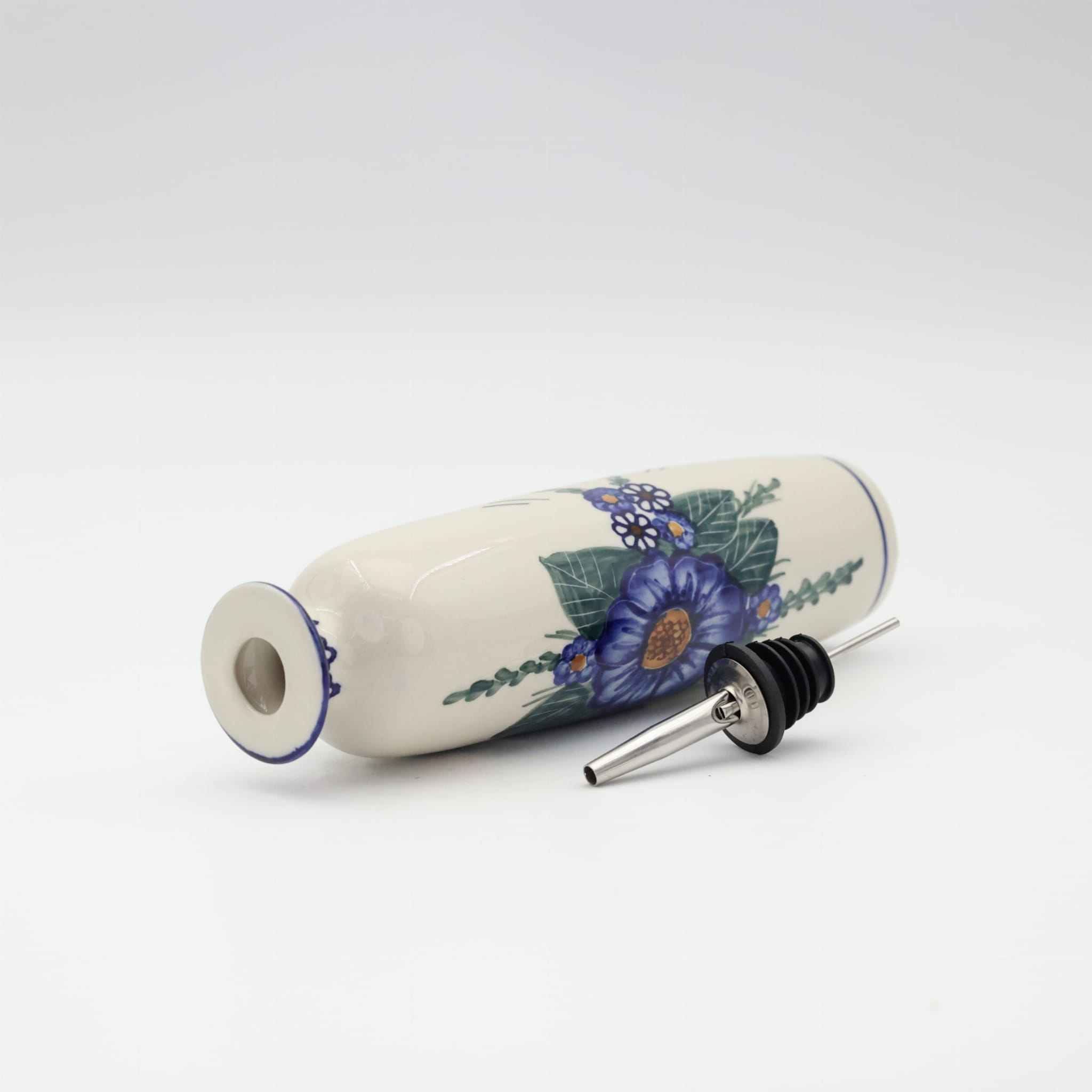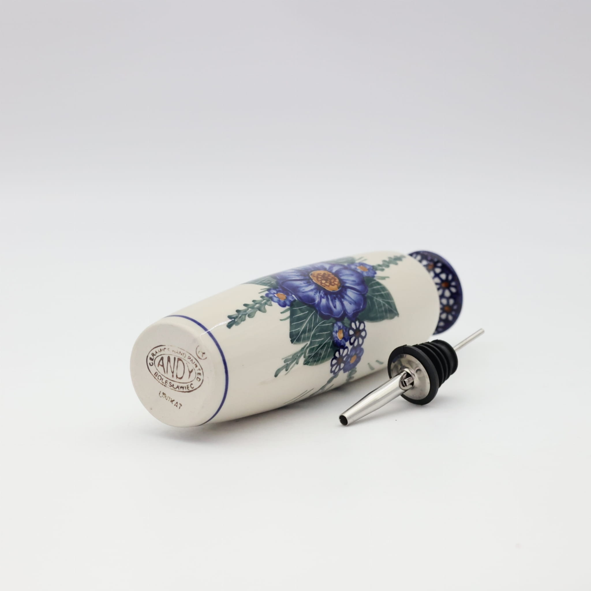 Butelka ceramiczna na oliwę o pojemności 450 ml. Bolesławiecka butelka okrągła z nalewakiem (dozownikiem).