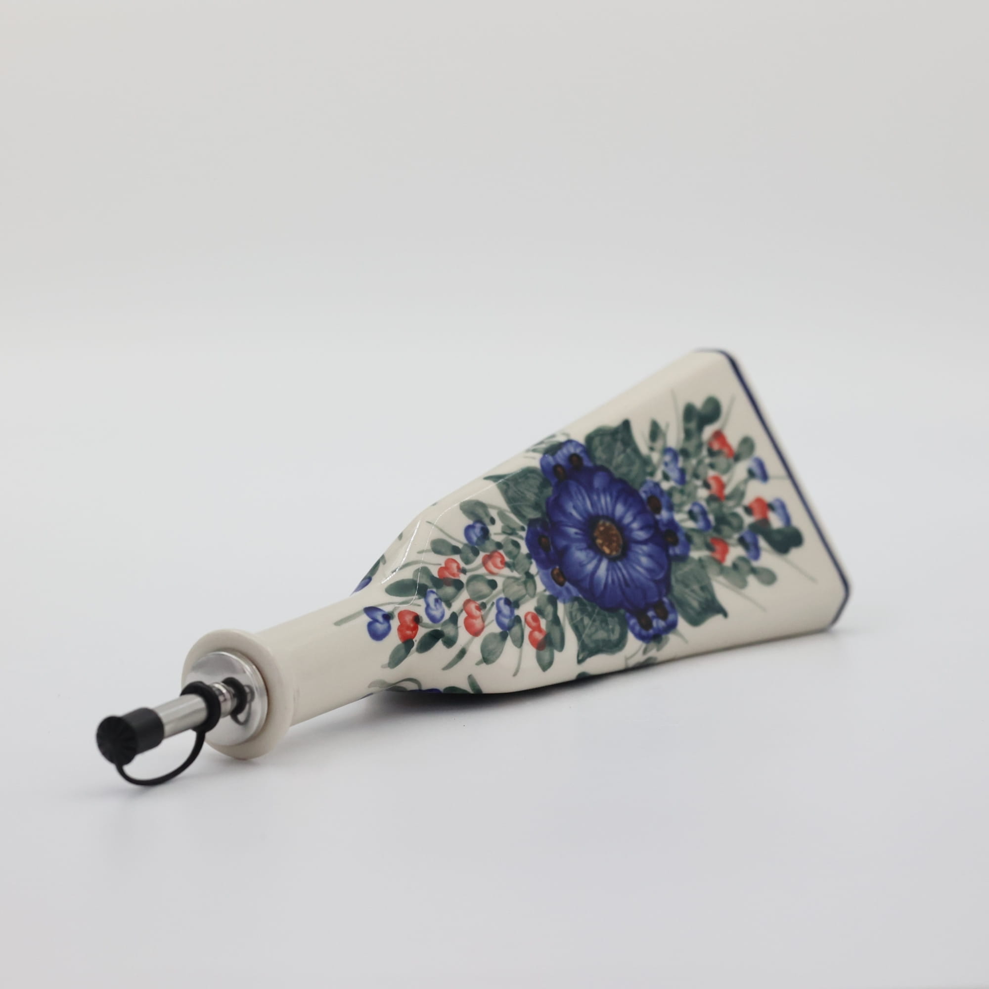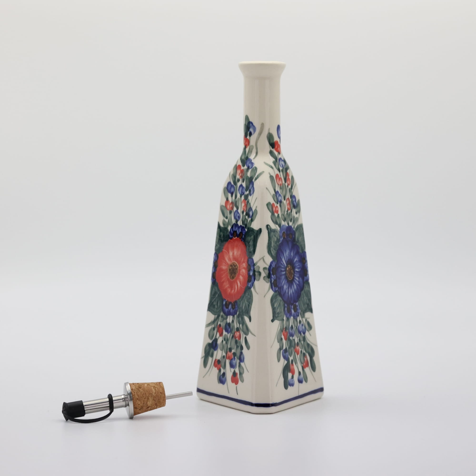 Butelka ceramiczna na oliwę o pojemności 450 ml. Bolesławiecka butelka trójkątna z nalewakiem (dozownikiem).