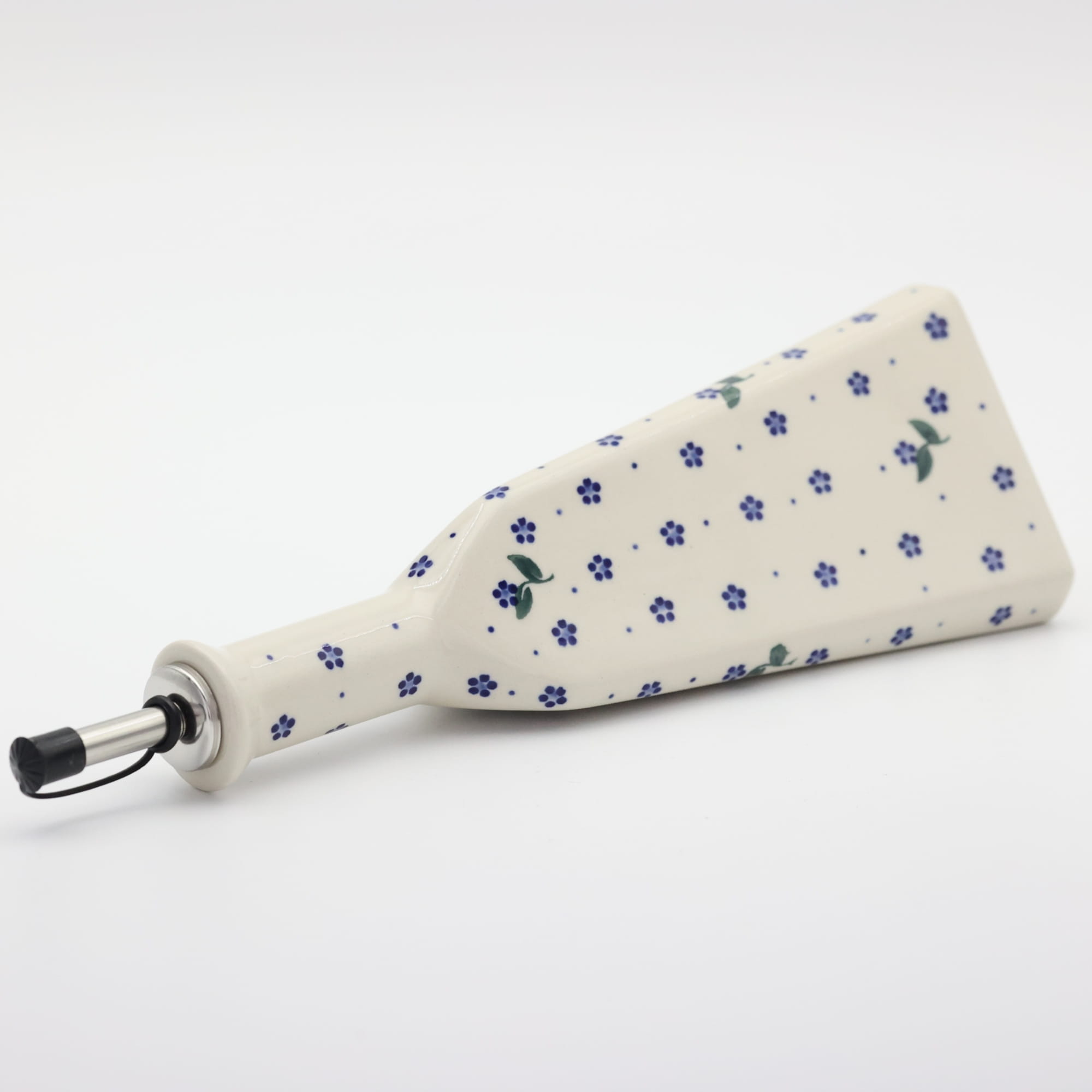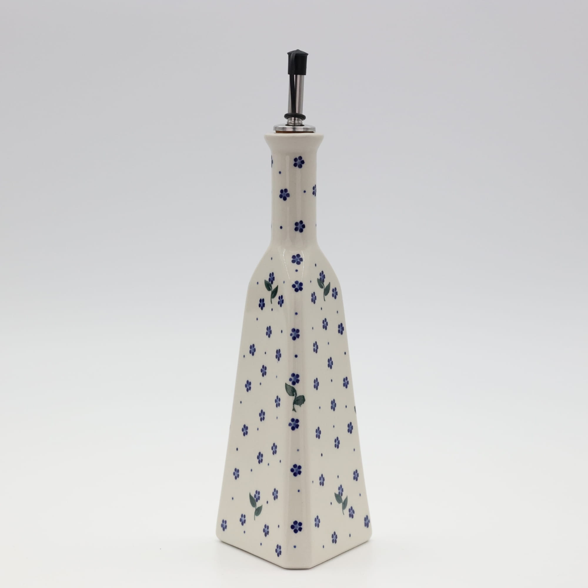 Butelka ceramiczna na oliwę o pojemności 450 ml. Bolesławiecka butelka trójkątna z nalewakiem (dozownikiem).