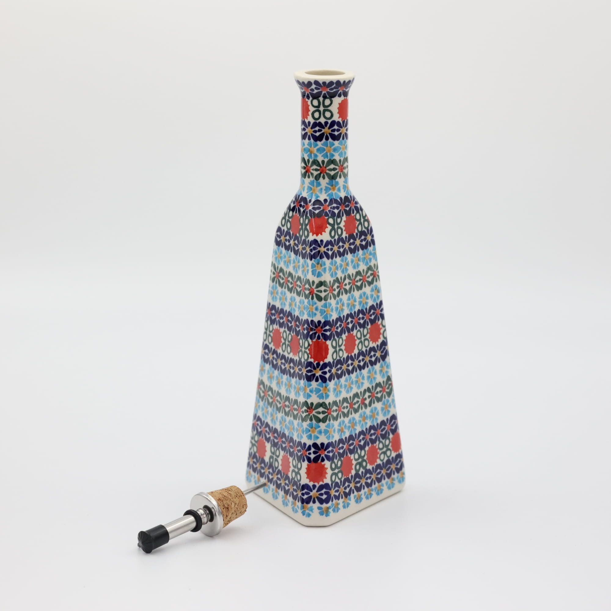 Butelka ceramiczna na oliwę o pojemności 450 ml. Bolesławiecka butelka trójkątna z nalewakiem (dozownikiem).
