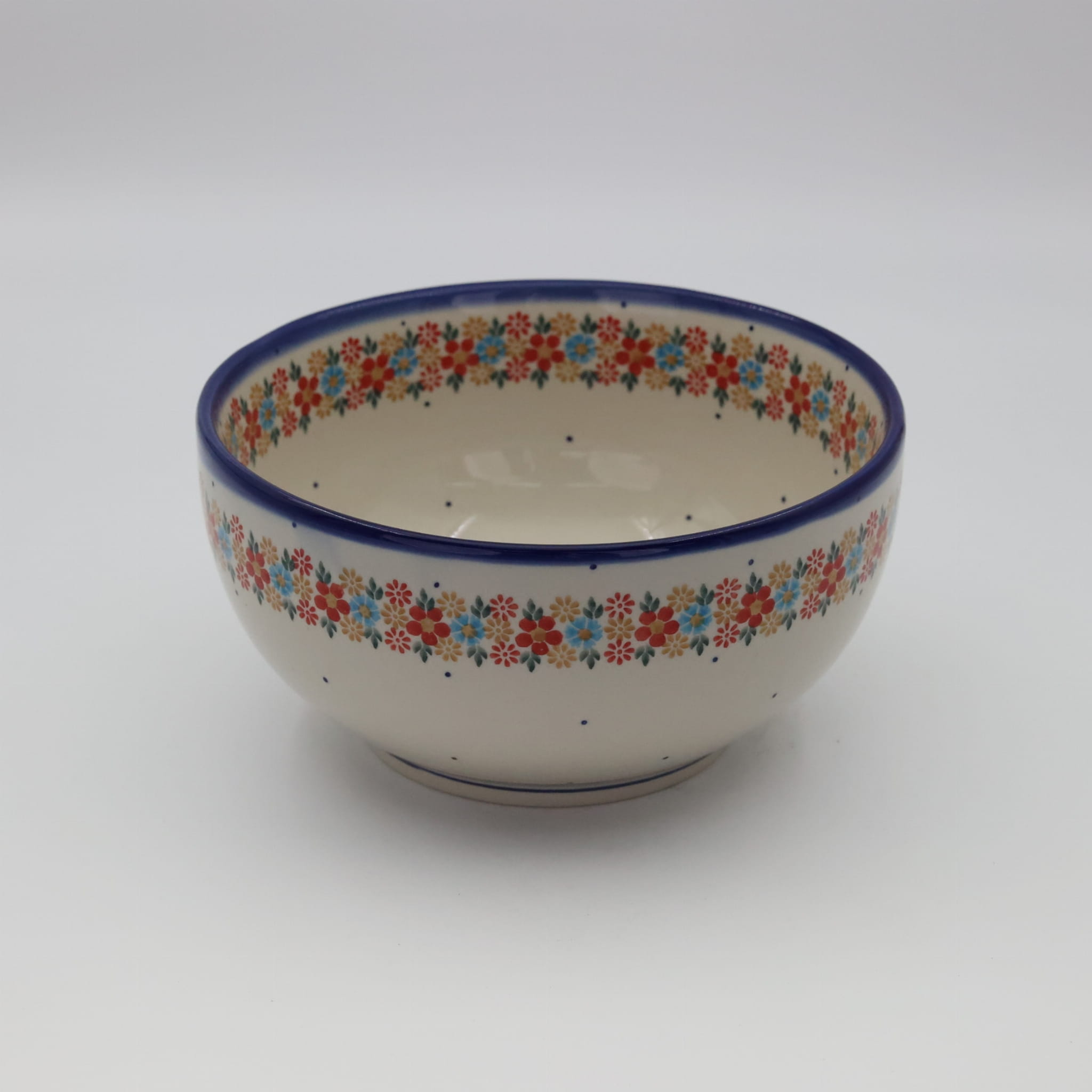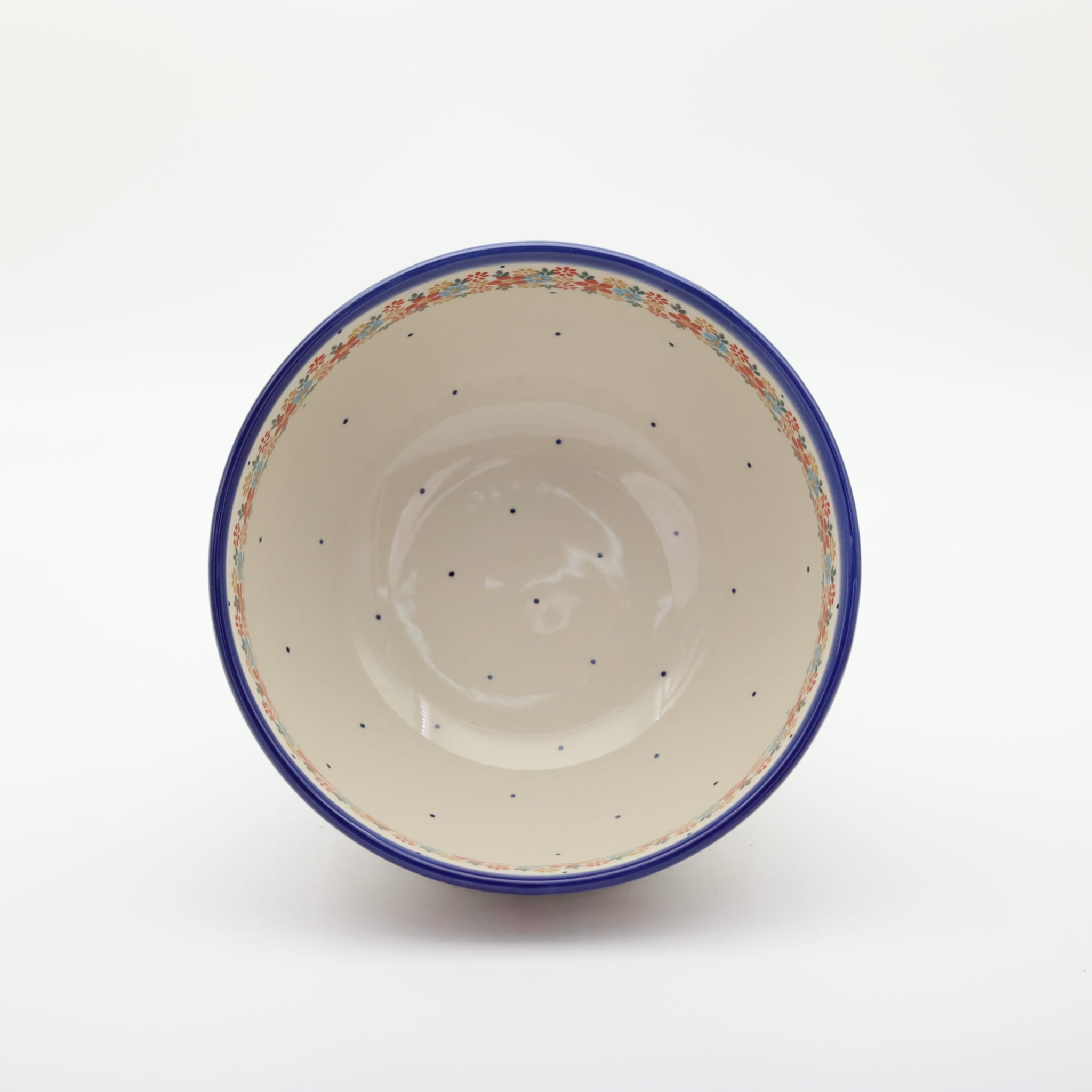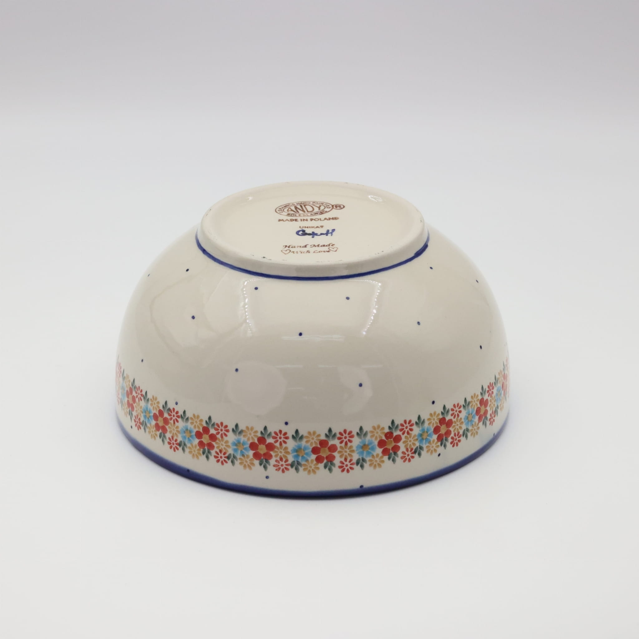 Oryginalny produkt ceramiki bolesławieckiej - miska ceramiczna z pięknym rantem zewnętrznym, salaterka o średnicy 23,5 cm z rantem, idealna do przygotowywania, podawania i przechowywania potraw. Niech Twoja potrawa będzie podana pięknie i smakuje wykwitnie dzięki artystycznym naczyniom ceramiki bolesławieckiej z rodzinnej manufaktury, CERAMIKA ANDY.