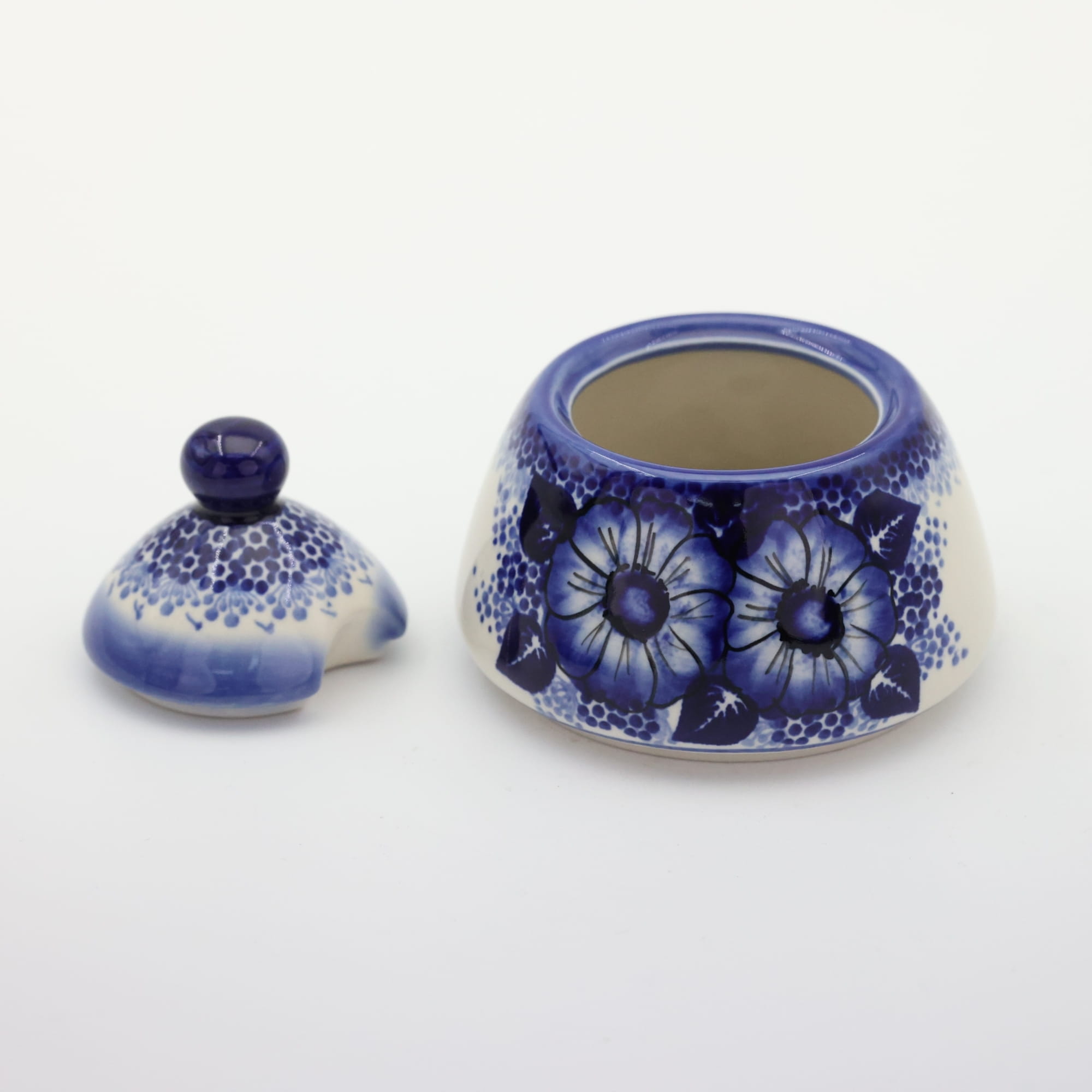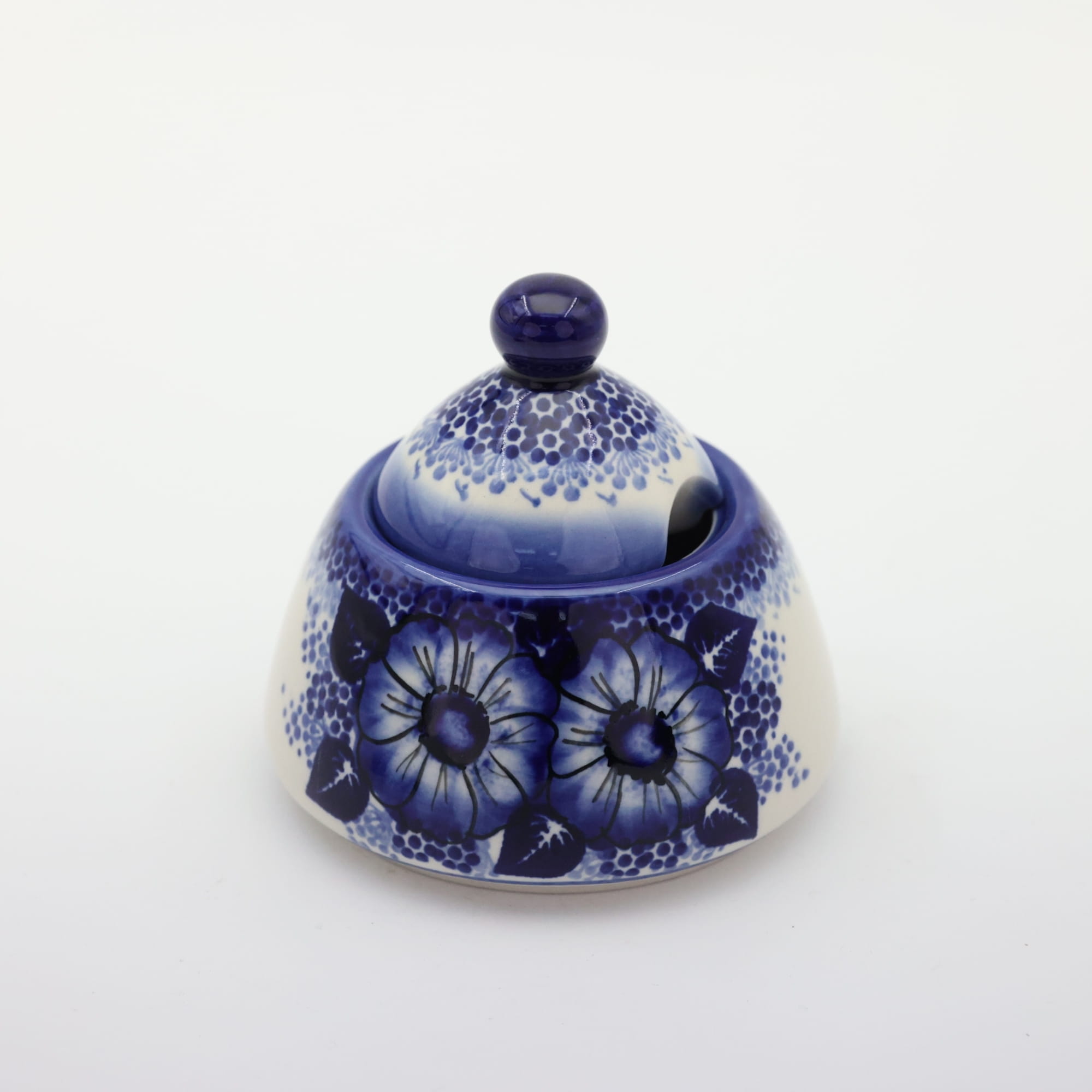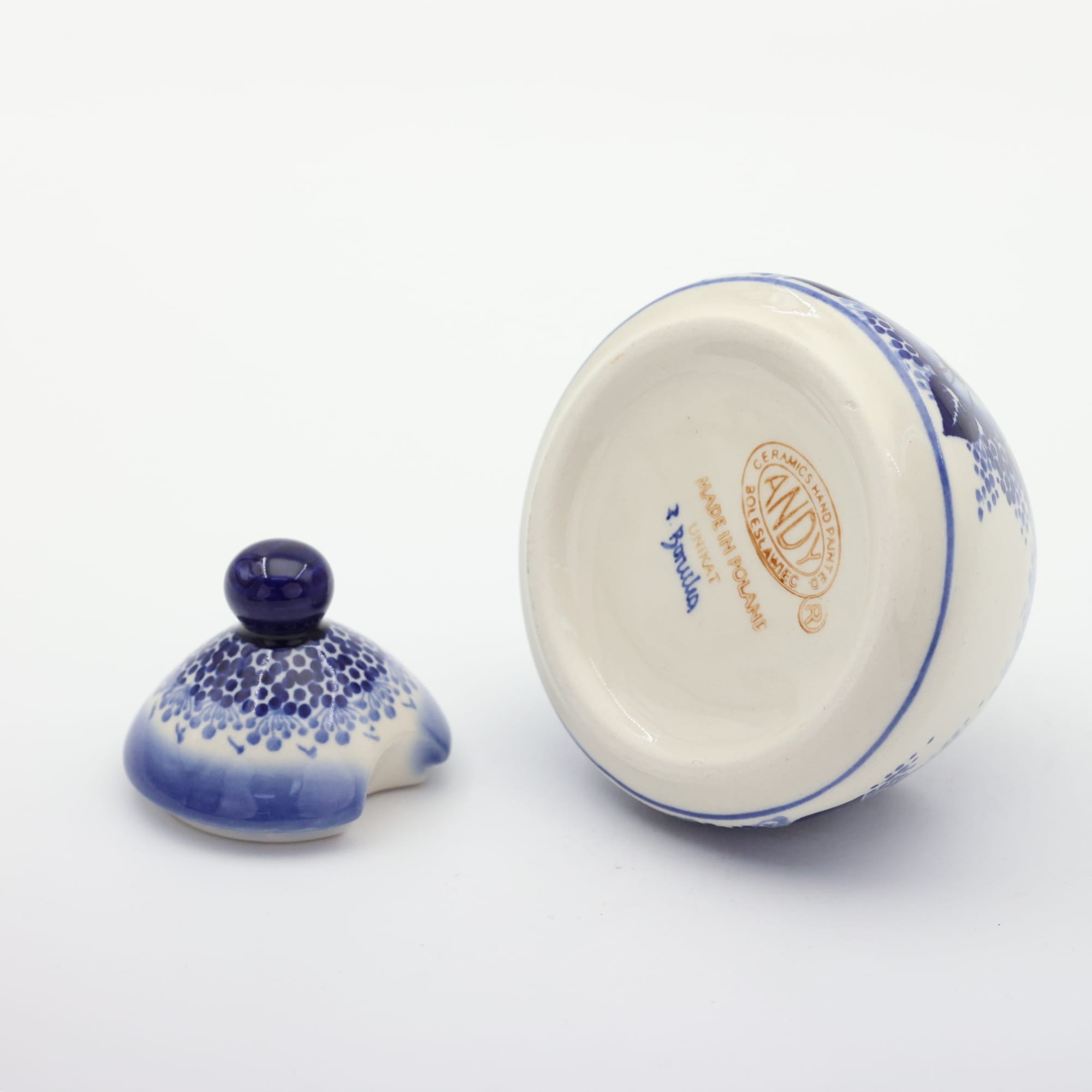 Cukiernica bolesławiecka, ręcznie zdobiona w tradycyjne wzory podszkliwne. Cukiernica to naczynie ceramiczne z pokrywką do przechowywania cukru białego lub innego rodzaju (trzcinowego, brązowego, cukru pudru, cukru waniliowego).