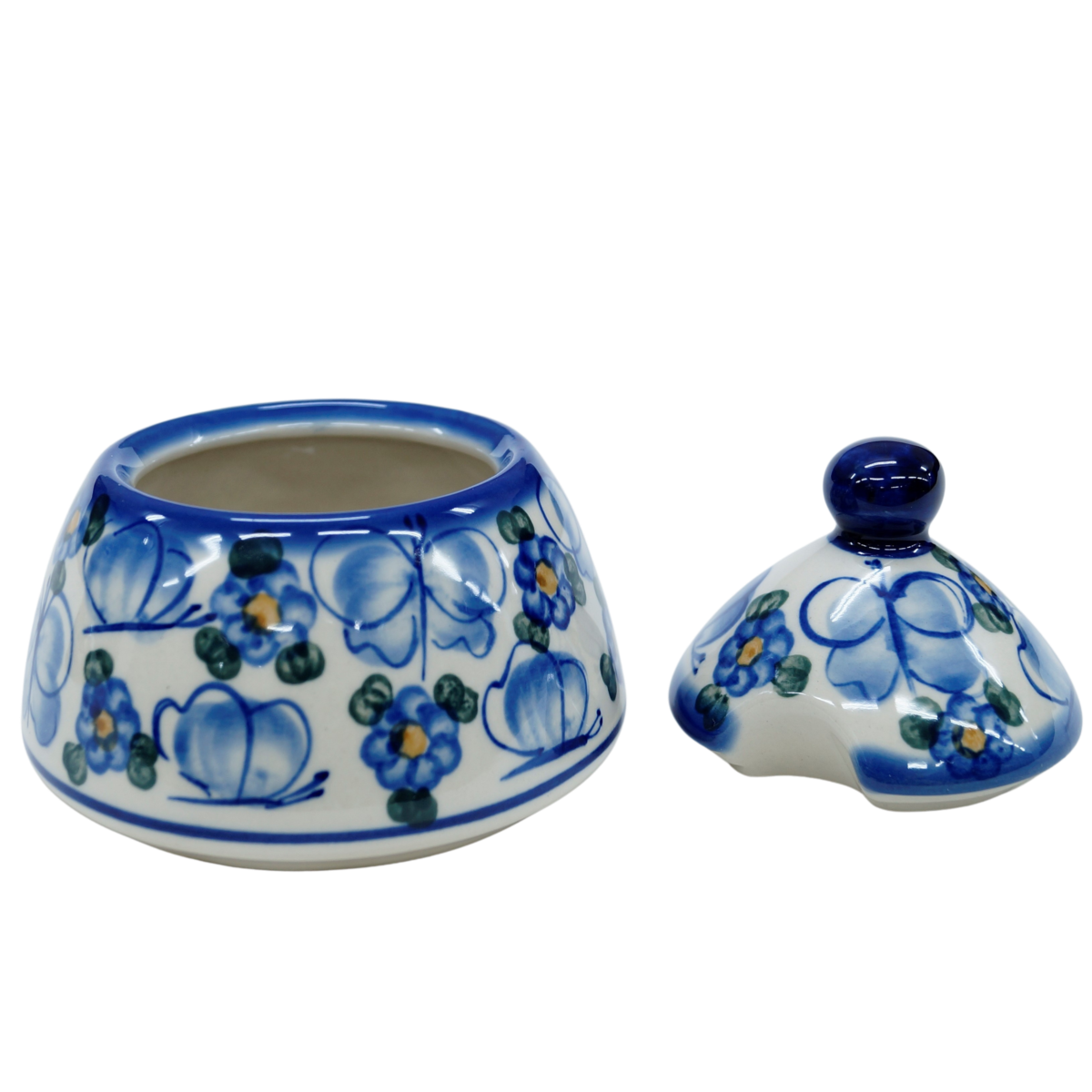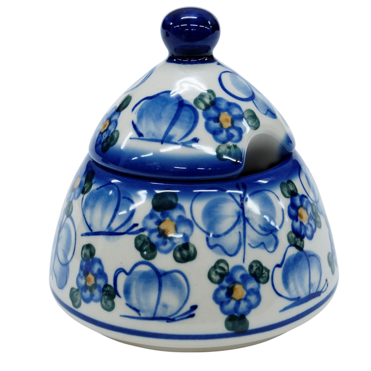 Cukiernica bolesławiecka, ręcznie zdobiona w tradycyjne wzory podszkliwne. Cukiernica to naczynie ceramiczne z pokrywką do przechowywania cukru białego lub innego rodzaju (trzcinowego, brązowego, cukru pudru, cukru waniliowego).