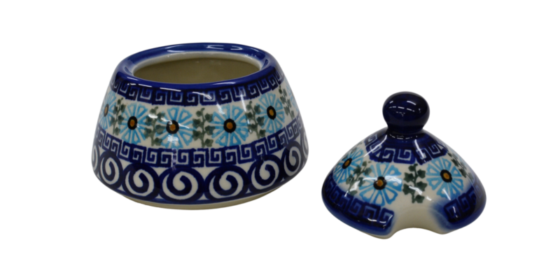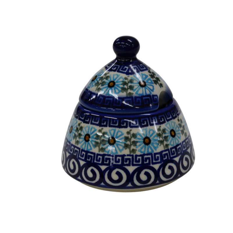 Cukiernica bolesławiecka, ręcznie zdobiona w tradycyjne wzory podszkliwne. Cukiernica to naczynie ceramiczne z pokrywką do przechowywania cukru białego lub innego rodzaju (trzcinowego, brązowego, cukru pudru, cukru waniliowego).