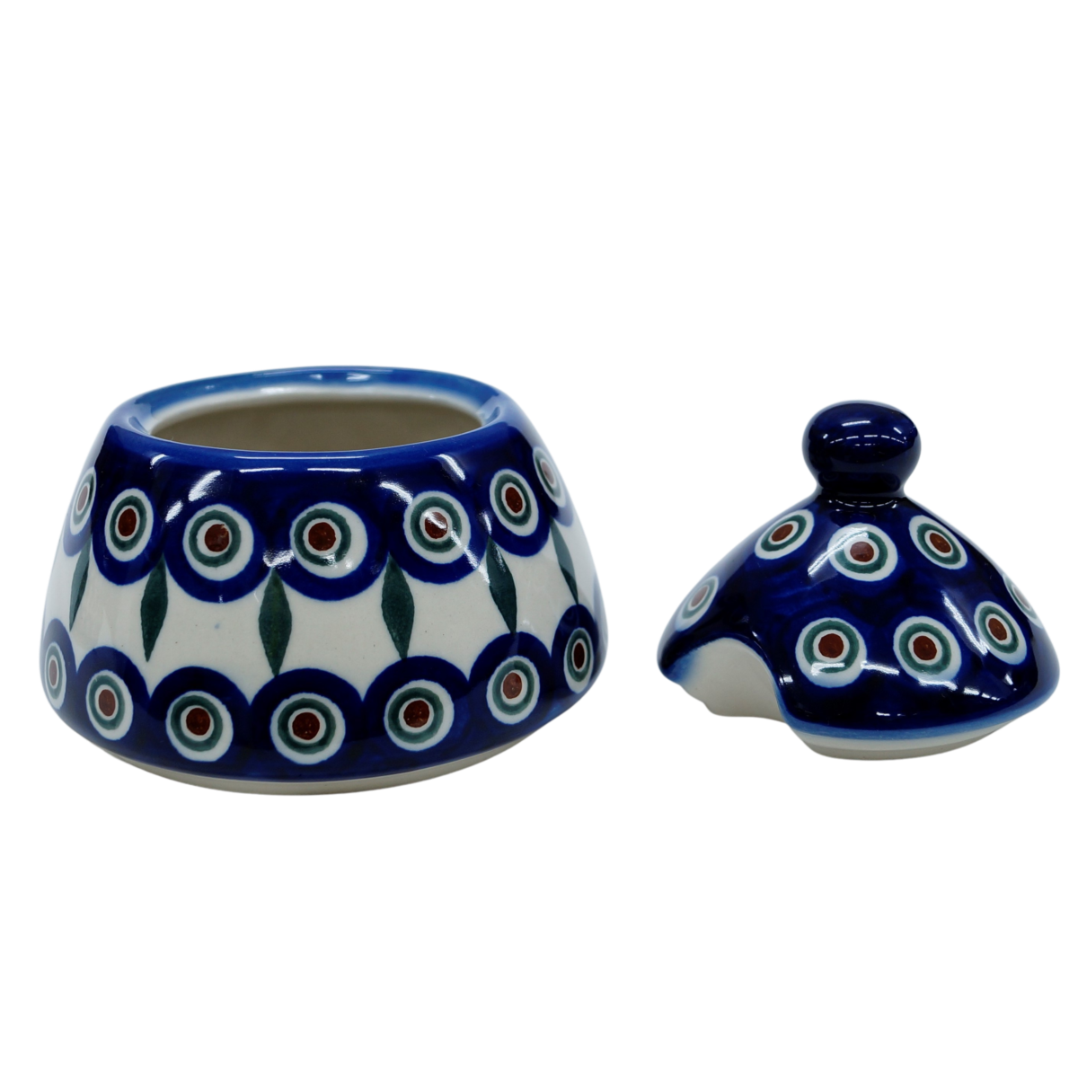 Cukiernica bolesławiecka, ręcznie zdobiona w tradycyjne wzory podszkliwne. Cukiernica to naczynie ceramiczne z pokrywką do przechowywania cukru białego lub innego rodzaju (trzcinowego, brązowego, cukru pudru, cukru waniliowego).