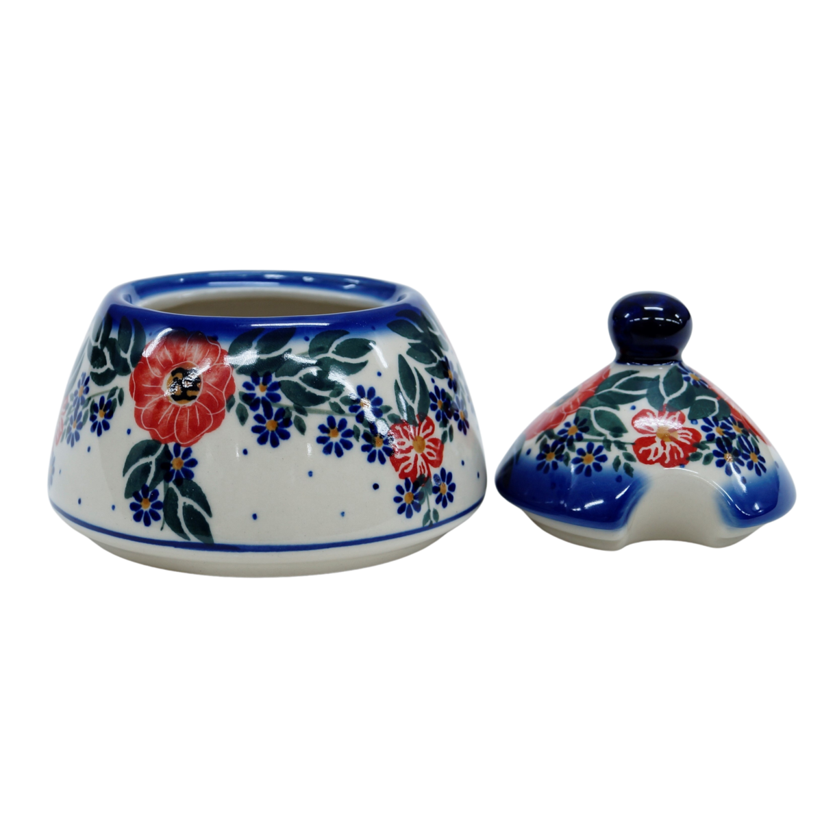 Cukiernica bolesławiecka, ręcznie zdobiona w tradycyjne wzory podszkliwne. Cukiernica to naczynie ceramiczne z pokrywką do przechowywania cukru białego lub innego rodzaju (trzcinowego, brązowego, cukru pudru, cukru waniliowego).