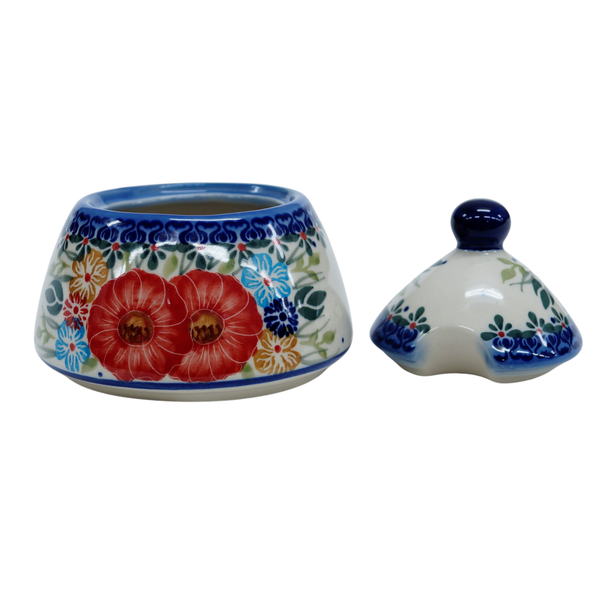 Cukiernica bolesławiecka, ręcznie zdobiona w tradycyjne wzory podszkliwne. Cukiernica to naczynie ceramiczne z pokrywką do przechowywania cukru białego lub innego rodzaju (trzcinowego, brązowego, cukru pudru, cukru waniliowego).