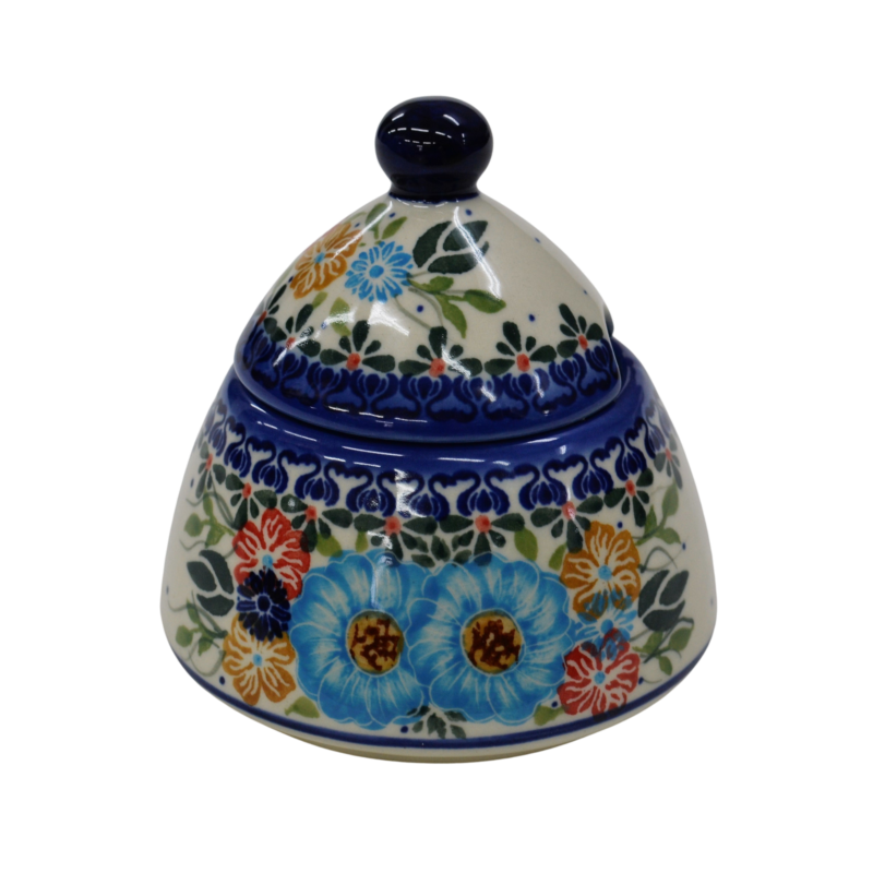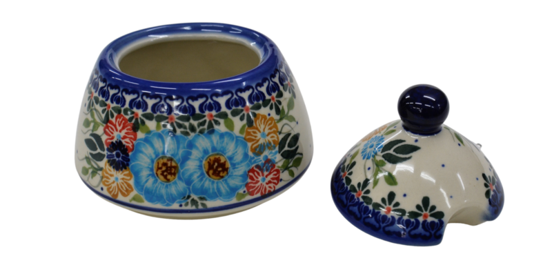 Cukiernica bolesławiecka, ręcznie zdobiona w tradycyjne wzory podszkliwne. Cukiernica to naczynie ceramiczne z pokrywką do przechowywania cukru białego lub innego rodzaju (trzcinowego, brązowego, cukru pudru, cukru waniliowego).
