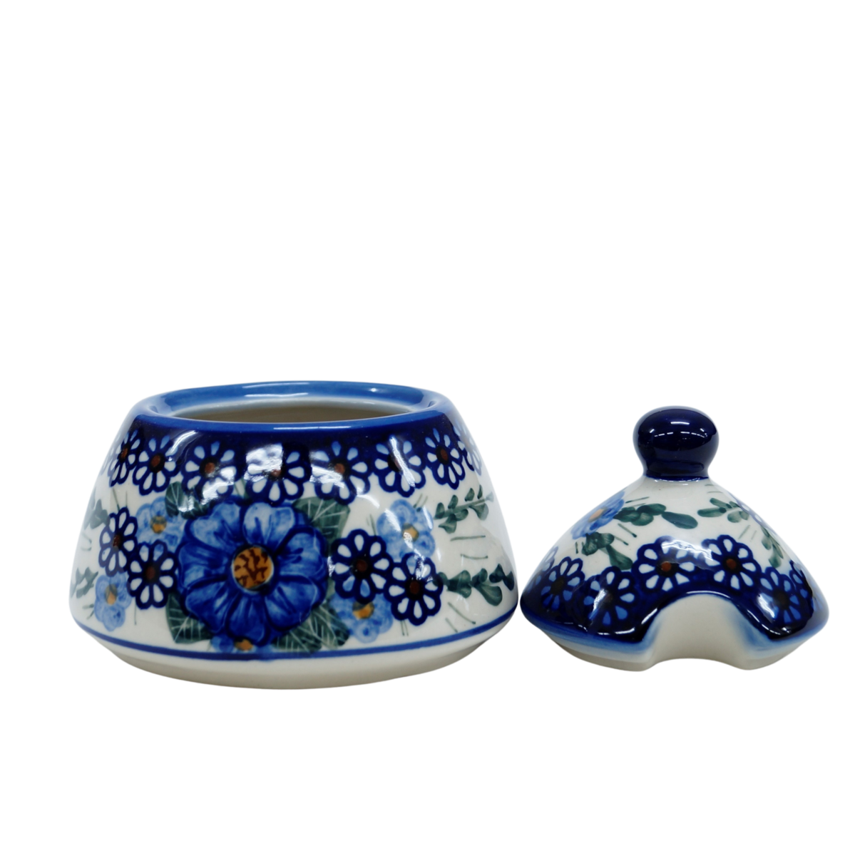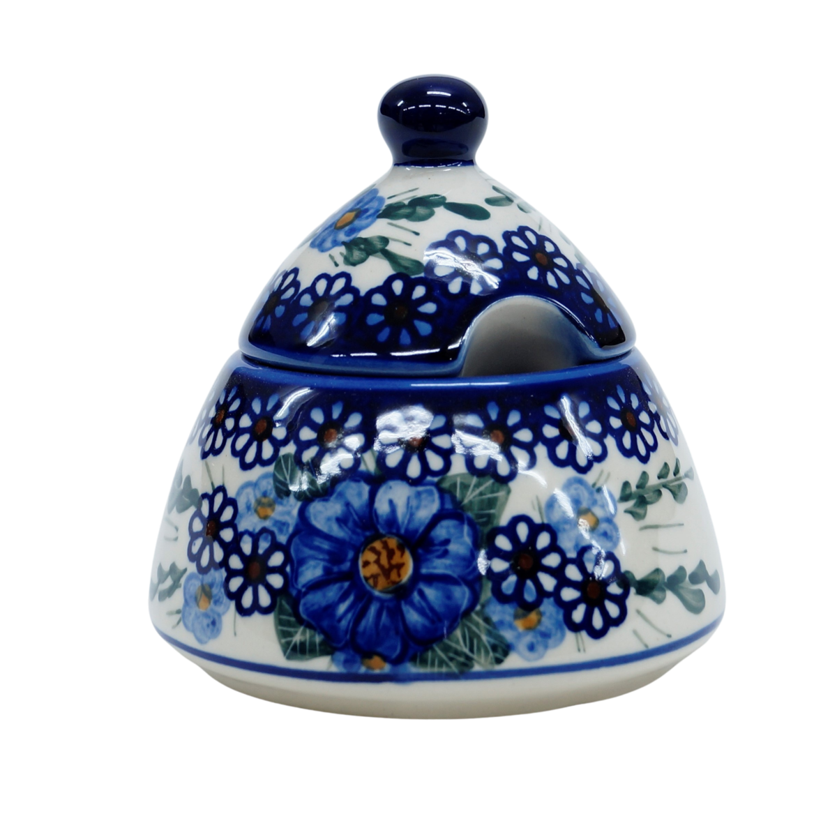 Cukiernica bolesławiecka, ręcznie zdobiona w tradycyjne wzory podszkliwne. Cukiernica to naczynie ceramiczne z pokrywką do przechowywania cukru białego lub innego rodzaju (trzcinowego, brązowego, cukru pudru, cukru waniliowego).