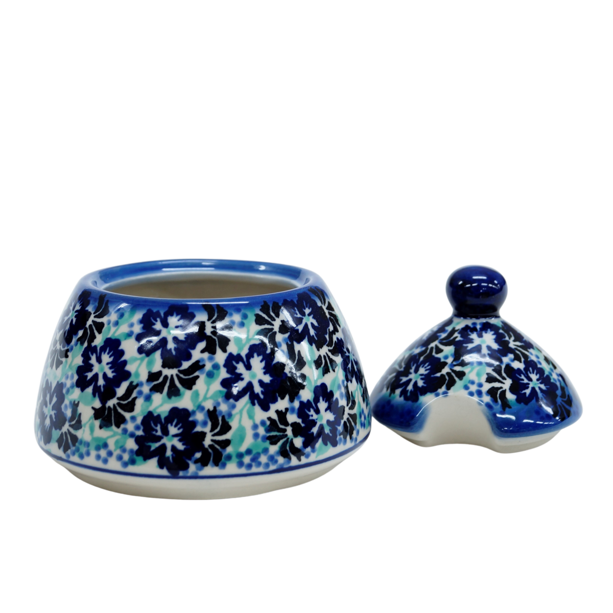 Cukiernica bolesławiecka, ręcznie zdobiona w tradycyjne wzory podszkliwne. Cukiernica to naczynie ceramiczne z pokrywką do przechowywania cukru białego lub innego rodzaju (trzcinowego, brązowego, cukru pudru, cukru waniliowego).