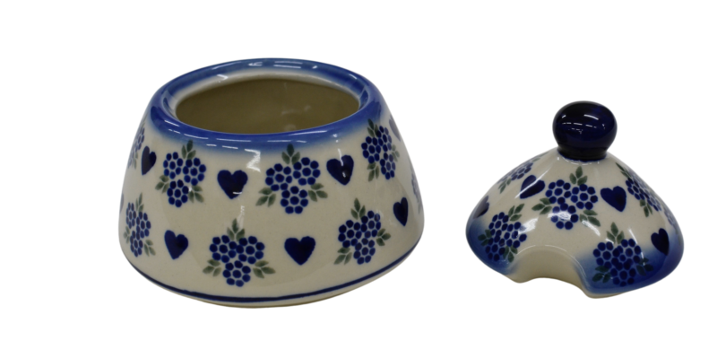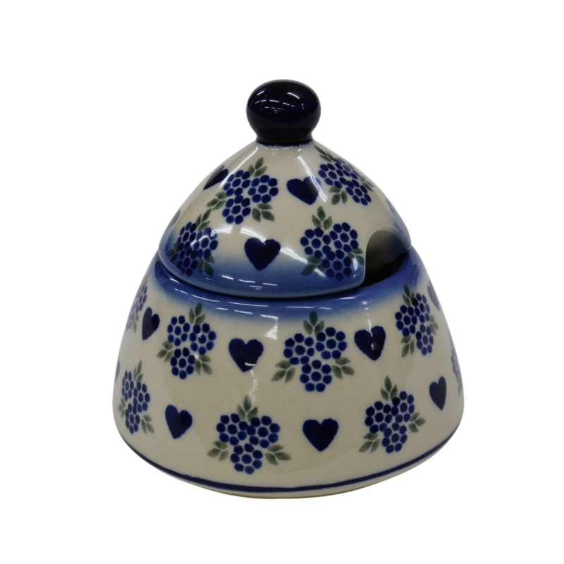 Cukiernica bolesławiecka, ręcznie zdobiona w tradycyjne wzory podszkliwne. Cukiernica to naczynie ceramiczne z pokrywką do przechowywania cukru białego lub innego rodzaju (trzcinowego, brązowego, cukru pudru, cukru waniliowego).
