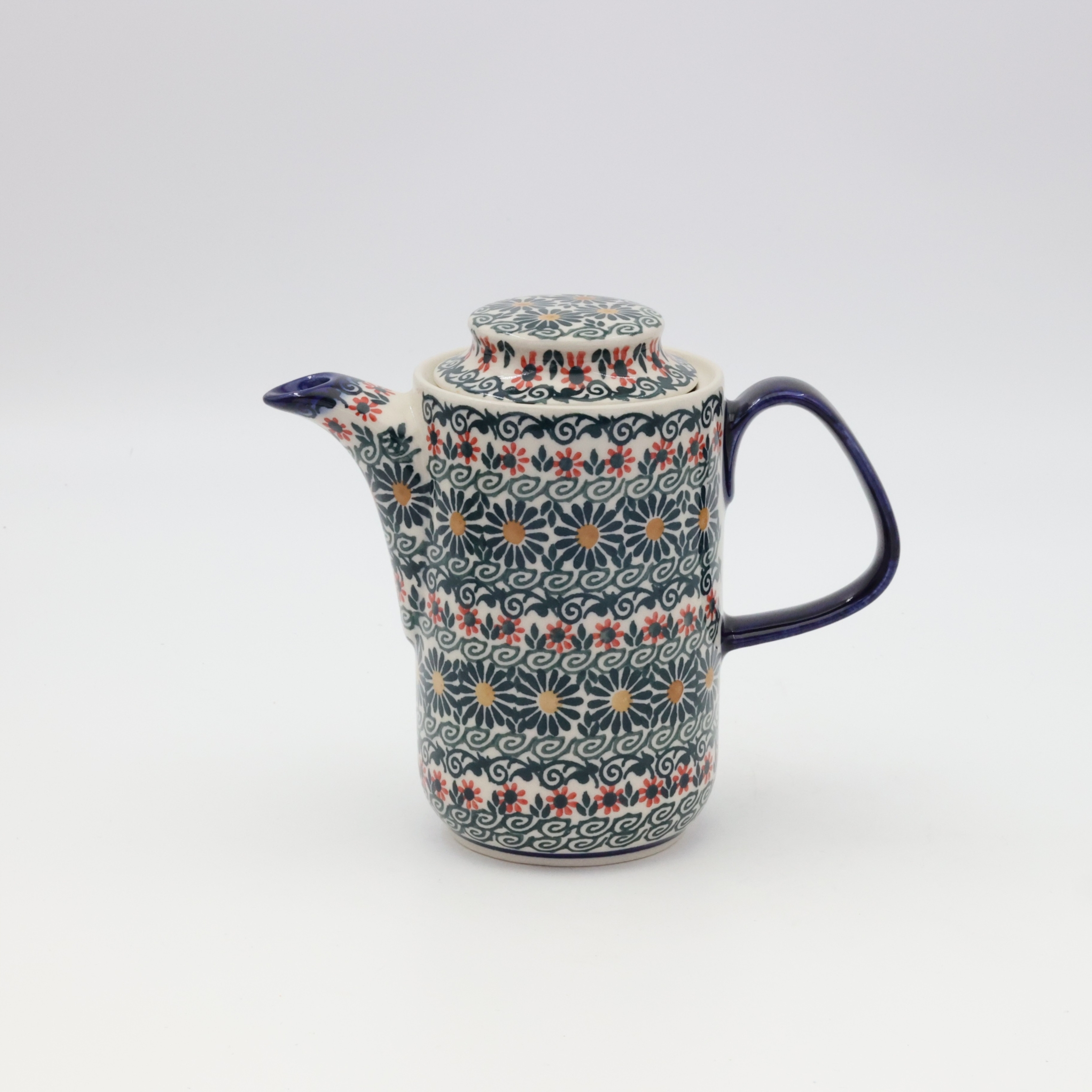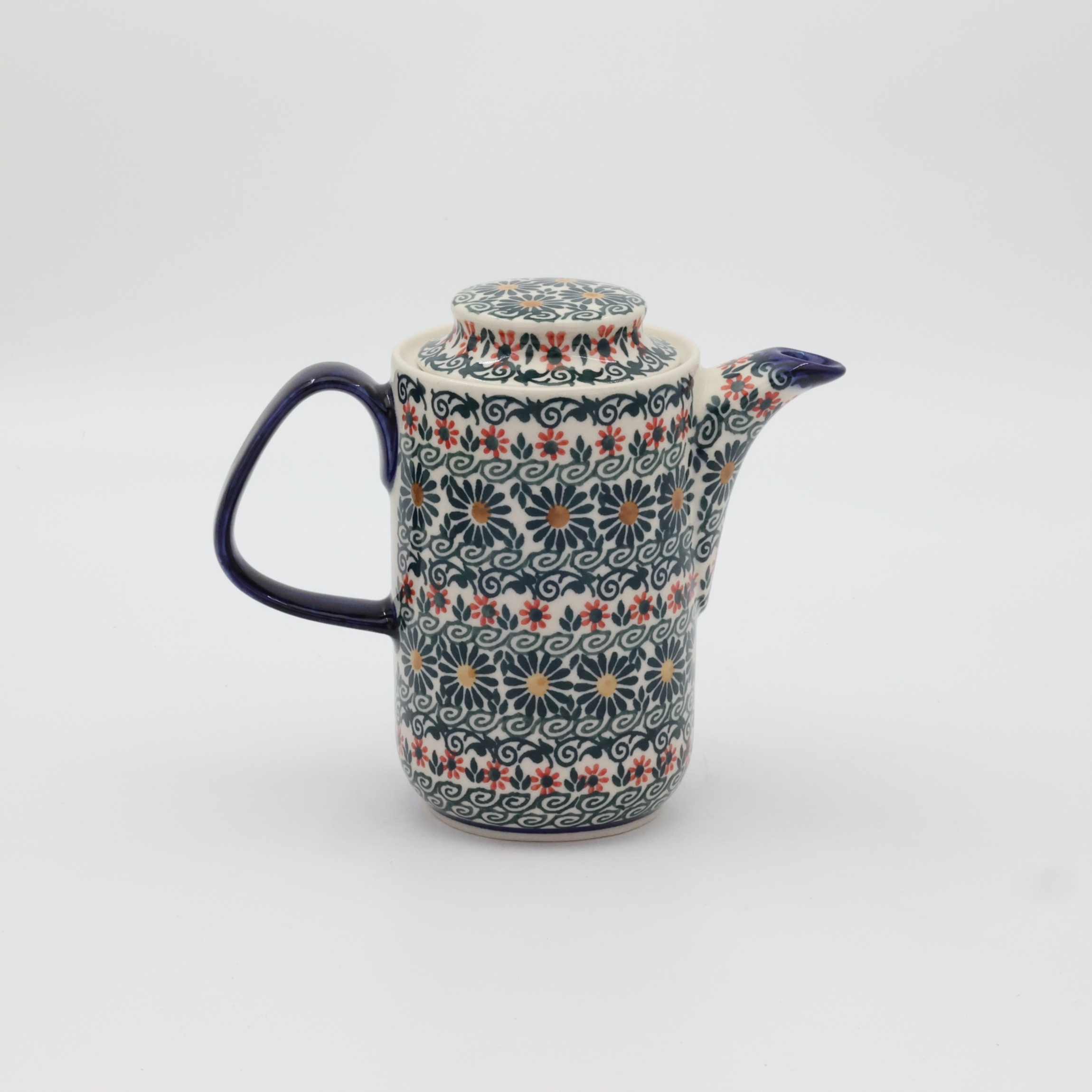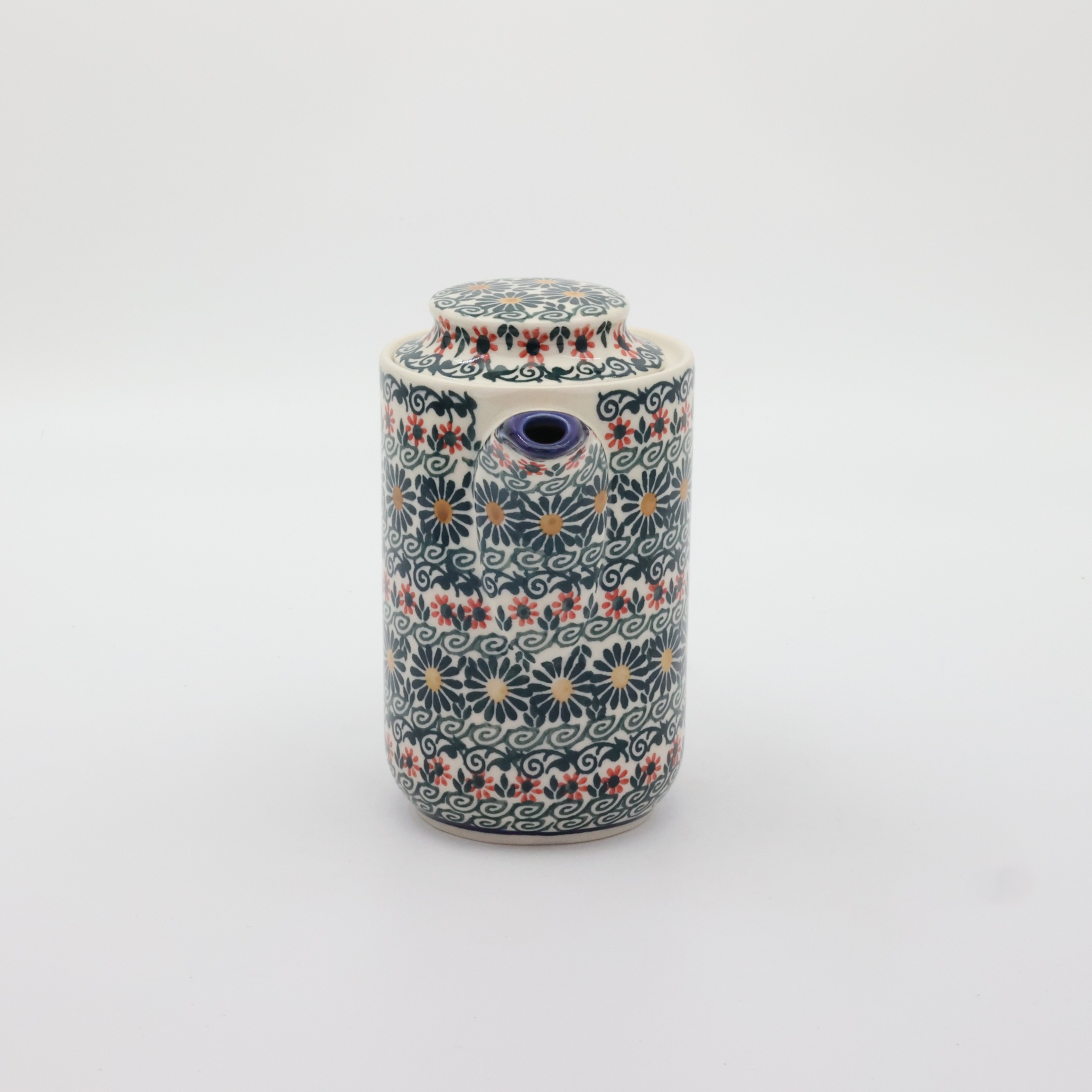 Czajnik ceramiczny z Bolesławca o pojemności 0,55 l to wyjątkowy wyrób rzemiosła artystycznego, który łączy w sobie tradycję i funkcjonalność. Wykonany z najwyższej jakości kamionki, charakteryzuje się niezwykłą trwałością i odpornością na wysokie temperatury. Jego powierzchnia zdobiona jest unikalnym, ręcznie malowanym wzorem, tworzonym przy użyciu charakterystycznej techniki stempelkowej, która jest znakiem rozpoznawczym ceramiki bolesławieckiej.