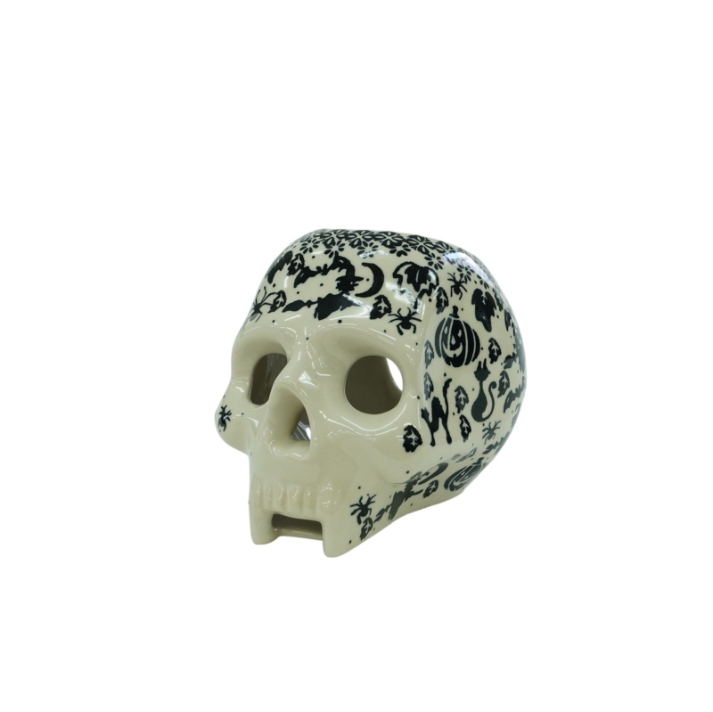 Ceramiczny lampion w kształcie czaszki ludzkiej z wycięciem na świeczkę w tylnej części produktu oraz pojemnikiem (miseczką) w górnej części wyrobu na olejek bądź wosk zapachowy. Podczas podgrzewania świeczką zostają uwolnione zapachy z wcześniej umieszczonych w naczyniu olejków bądź innych substancji wonnych. Produkt jest oryginalnym elementem dekoracji wnętrza pokoju, doskonała ozdoba z okazji Halloween bądź element strasznej dekoracji.