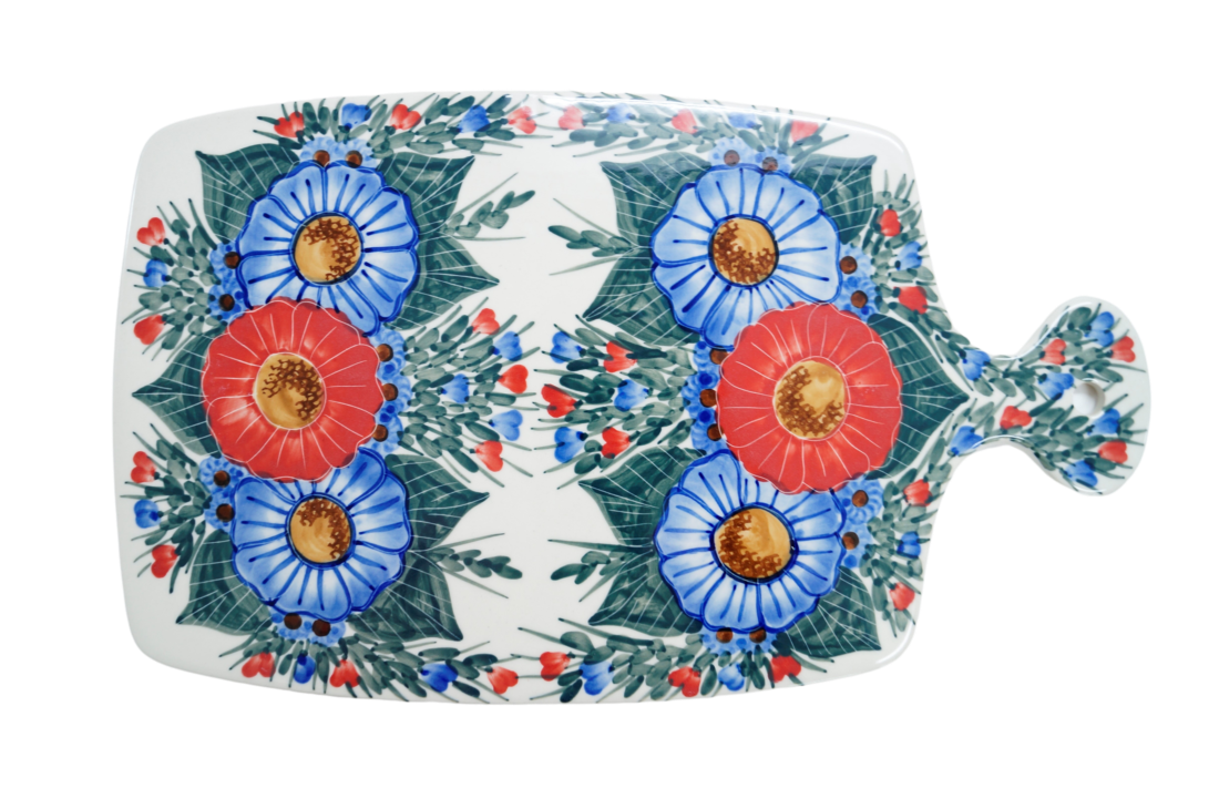 Deska do krojenia duża z otworem, który umożliwia jej przywieszenie w kuchni jako ceramiczny element dekoracyjny bądź użytkowy. Rewelacyjnie prezentuje się jako dekoracja ściany, pozwalają na to śliczne wzory kwiatowe czy zdobiny tradycyjne, stempelkowe charakterystyczne dla ceramiki kamionkowej z Bolesławca. Wielkość deski pozwala do wykorzystania jej jako podkładkę pod gorące patelnie, garnki czy naczynia ceramiczne do zapiekania bądź klasyczne żaroodporne i metalowe, których każda gospodyni czy kucharz w swoich szafkach kuchennych posiadają tuziny.
