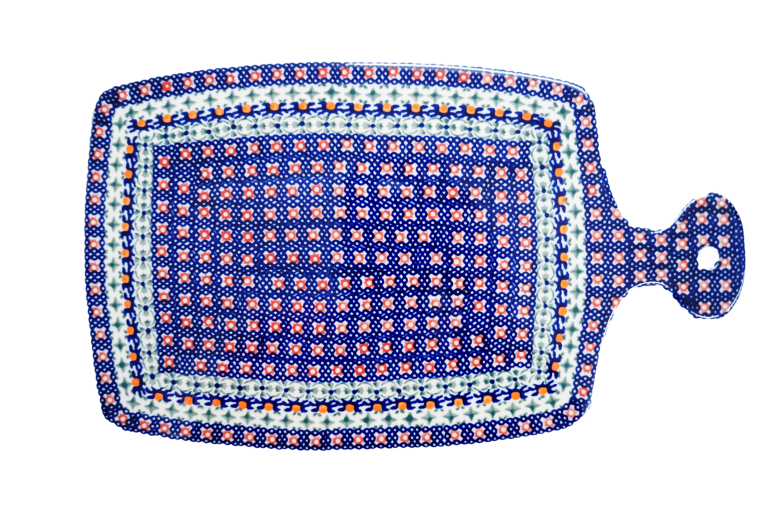Deska do krojenia duża z otworem, który umożliwia jej przywieszenie w kuchni jako ceramiczny element dekoracyjny bądź użytkowy. Rewelacyjnie prezentuje się jako dekoracja ściany, pozwalają na to śliczne wzory kwiatowe czy zdobiny tradycyjne, stempelkowe charakterystyczne dla ceramiki kamionkowej z Bolesławca. Wielkość deski pozwala do wykorzystania jej jako podkładkę pod gorące patelnie, garnki czy naczynia ceramiczne do zapiekania bądź klasyczne żaroodporne i metalowe, których każda gospodyni czy kucharz w swoich szafkach kuchennych posiadają tuziny.