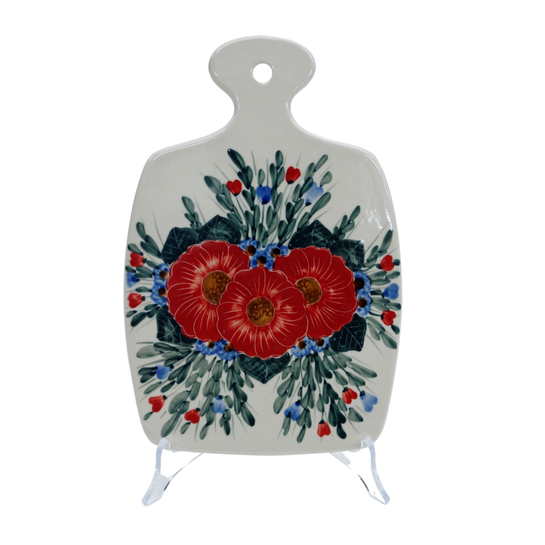 Rewelacyjnie prezentuje się jako dekoracja ściany, pozwalają na to śliczne wzory kwiatowe czy zdobiny tradycyjne, stempelkowe charakterystyczne dla ceramiki kamionkowej z Bolesławca. Wielkość deski pozwala do wykorzystania jej jako podkładkę pod gorące patelnie, garnki czy naczynia do zapiekania ceramiczne bądź klasyczne żaroodporne i metalowe, których każda gospodyni czy kucharz w swoich szafkach kuchennych posiadają tuziny.