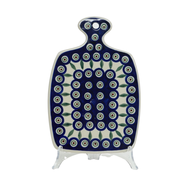 Rewelacyjnie prezentuje się jako dekoracja ściany, pozwalają na to śliczne wzory kwiatowe czy zdobiny tradycyjne, stempelkowe charakterystyczne dla ceramiki kamionkowej z Bolesławca. Wielkość deski pozwala do wykorzystania jej jako podkładkę pod gorące patelnie, garnki czy naczynia do zapiekania ceramiczne bądź klasyczne żaroodporne i metalowe, których każda gospodyni czy kucharz w swoich szafkach kuchennych posiadają tuziny.