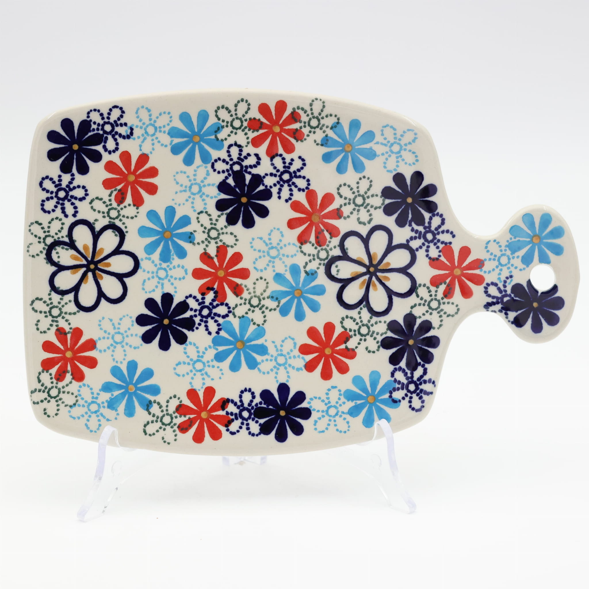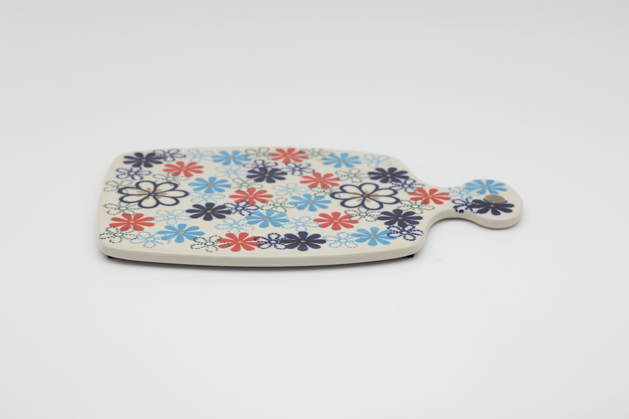 Rewelacyjnie prezentuje się jako dekoracja ściany, pozwalają na to śliczne wzory kwiatowe czy zdobiny tradycyjne, stempelkowe charakterystyczne dla ceramiki kamionkowej z Bolesławca. Wielkość deski pozwala do wykorzystania jej jako podkładkę pod gorące patelnie, garnki czy naczynia do zapiekania ceramiczne bądź klasyczne żaroodporne i metalowe, których każda gospodyni czy kucharz w swoich szafkach kuchennych posiadają tuziny.