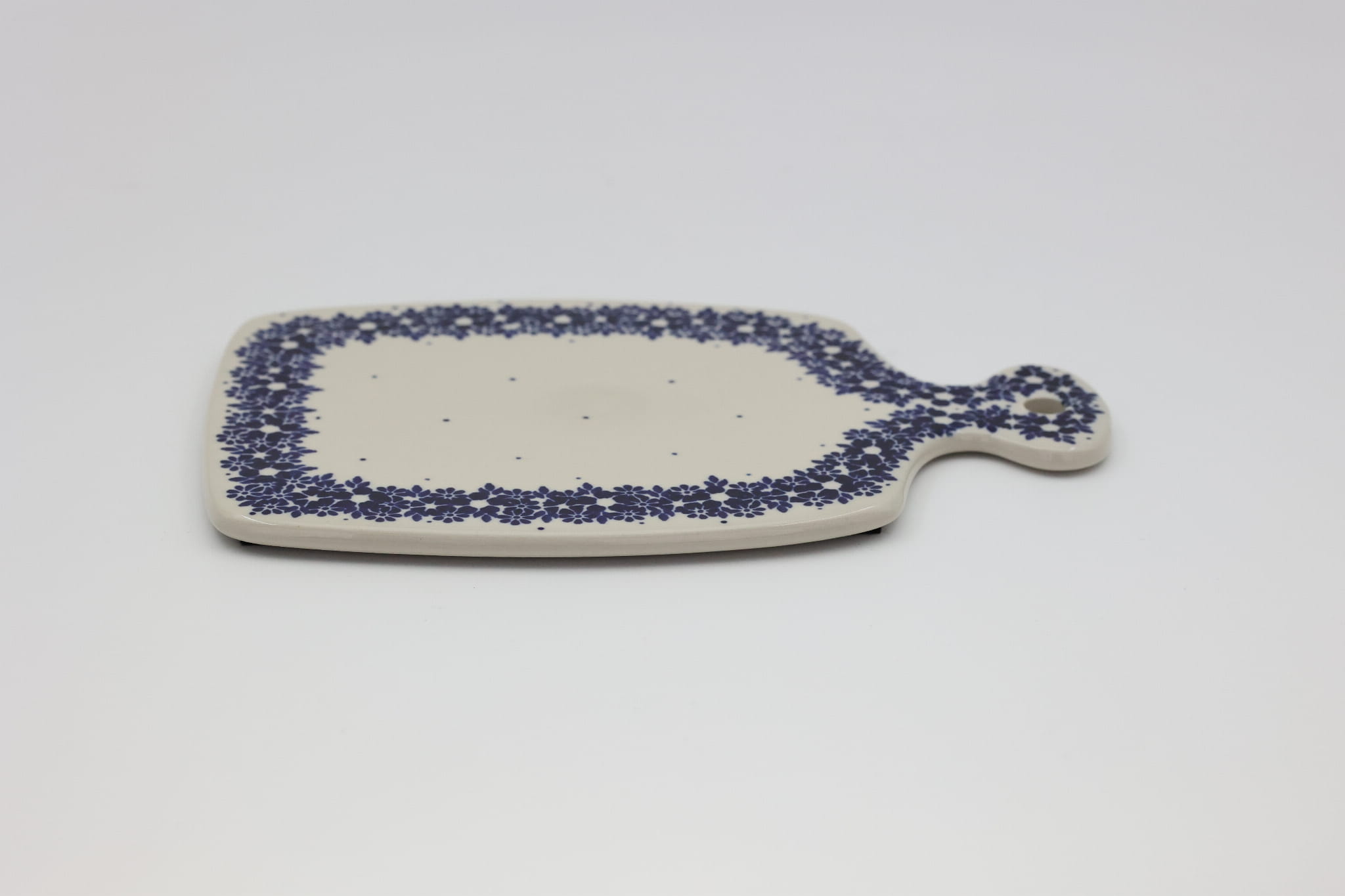 Rewelacyjnie prezentuje się jako dekoracja ściany, pozwalają na to śliczne wzory kwiatowe czy zdobiny tradycyjne, stempelkowe charakterystyczne dla ceramiki kamionkowej z Bolesławca. Wielkość deski pozwala do wykorzystania jej jako podkładkę pod gorące patelnie, garnki czy naczynia do zapiekania ceramiczne bądź klasyczne żaroodporne i metalowe, których każda gospodyni czy kucharz w swoich szafkach kuchennych posiadają tuziny.