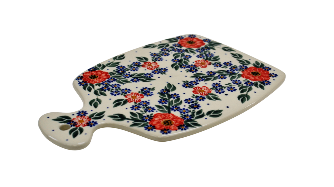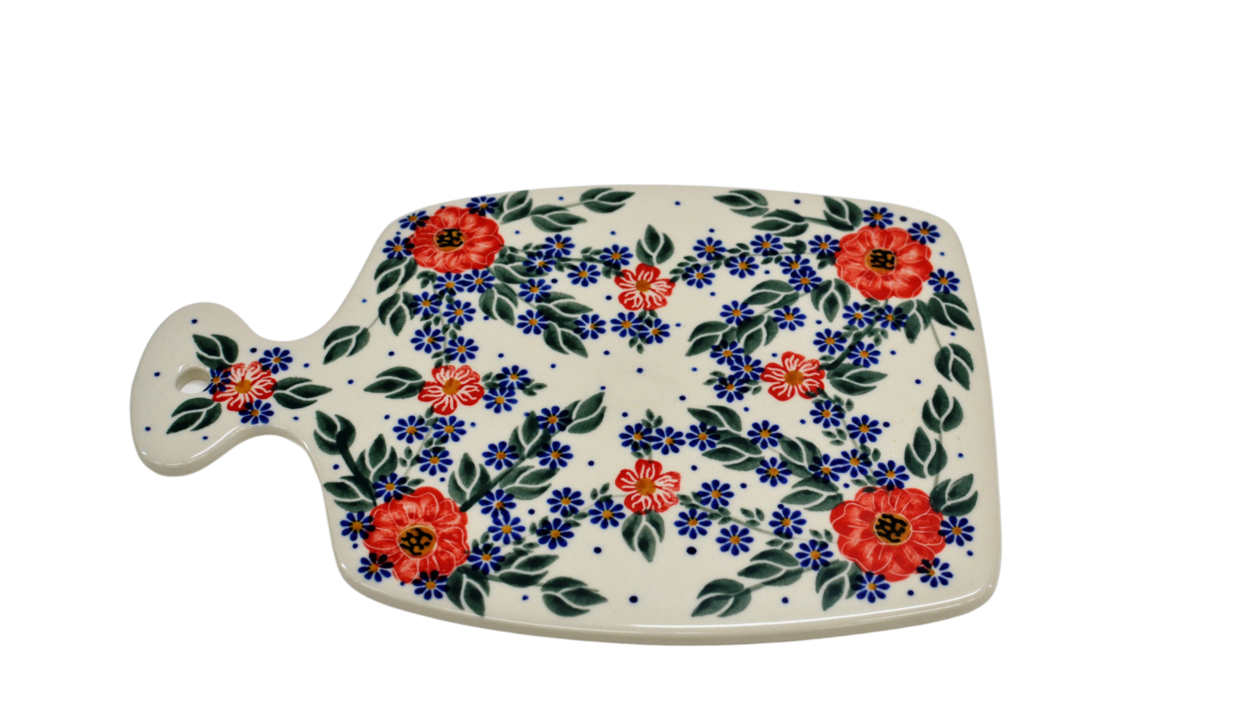 Rewelacyjnie prezentuje się jako dekoracja ściany, pozwalają na to śliczne wzory kwiatowe czy zdobiny tradycyjne, stempelkowe charakterystyczne dla ceramiki kamionkowej z Bolesławca. Wielkość deski pozwala do wykorzystania jej jako podkładkę pod gorące patelnie, garnki czy naczynia do zapiekania ceramiczne bądź klasyczne żaroodporne i metalowe, których każda gospodyni czy kucharz w swoich szafkach kuchennych posiadają tuziny.