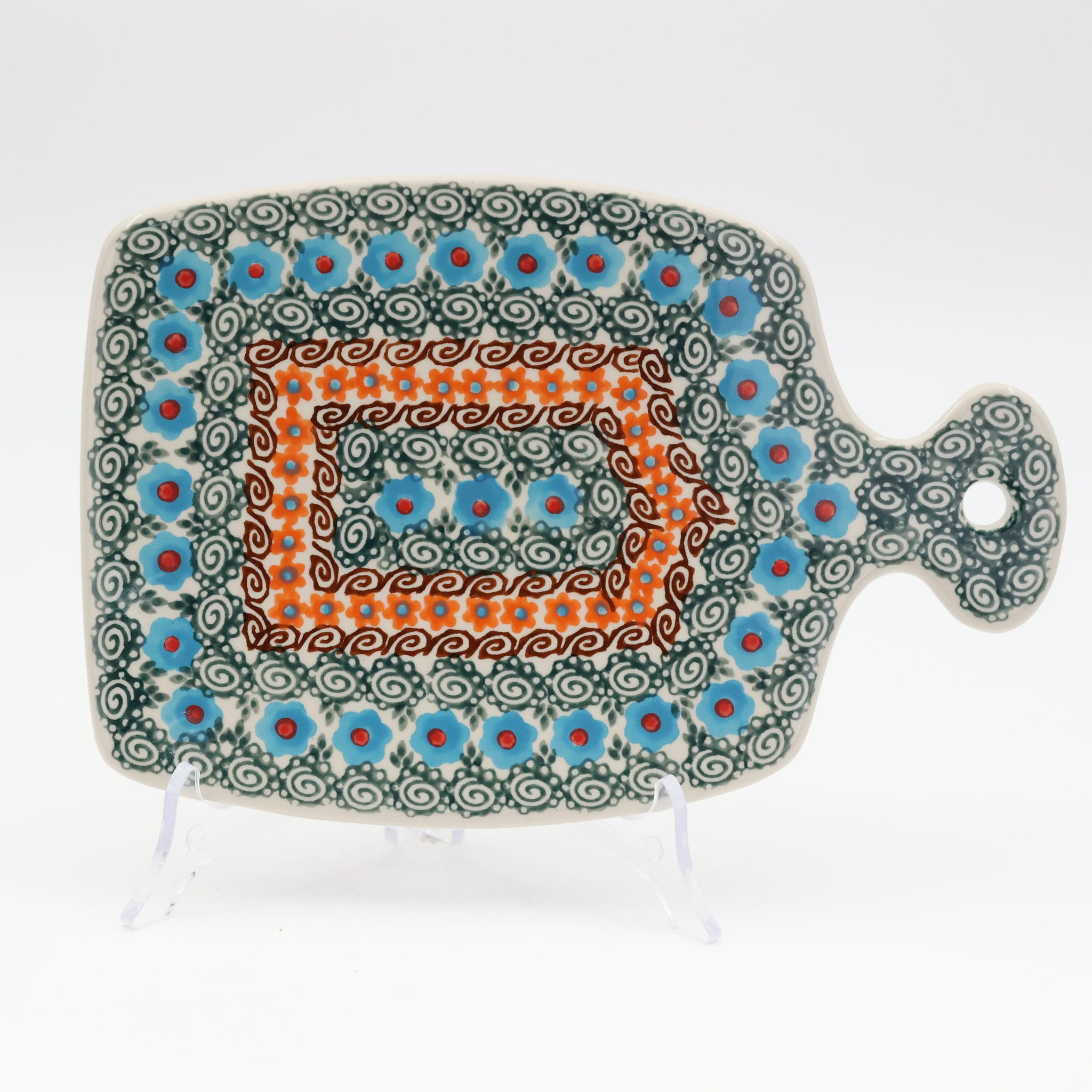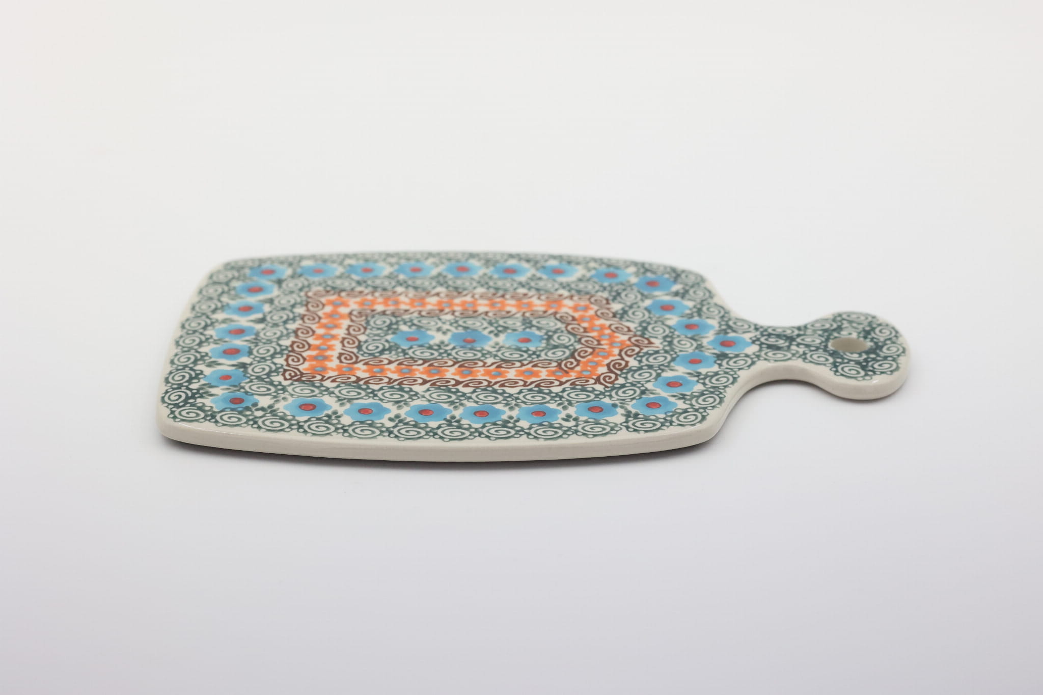 Rewelacyjnie prezentuje się jako dekoracja ściany, pozwalają na to śliczne wzory kwiatowe czy zdobiny tradycyjne, stempelkowe charakterystyczne dla ceramiki kamionkowej z Bolesławca. Wielkość deski pozwala do wykorzystania jej jako podkładkę pod gorące patelnie, garnki czy naczynia do zapiekania ceramiczne bądź klasyczne żaroodporne i metalowe, których każda gospodyni czy kucharz w swoich szafkach kuchennych posiadają tuziny.