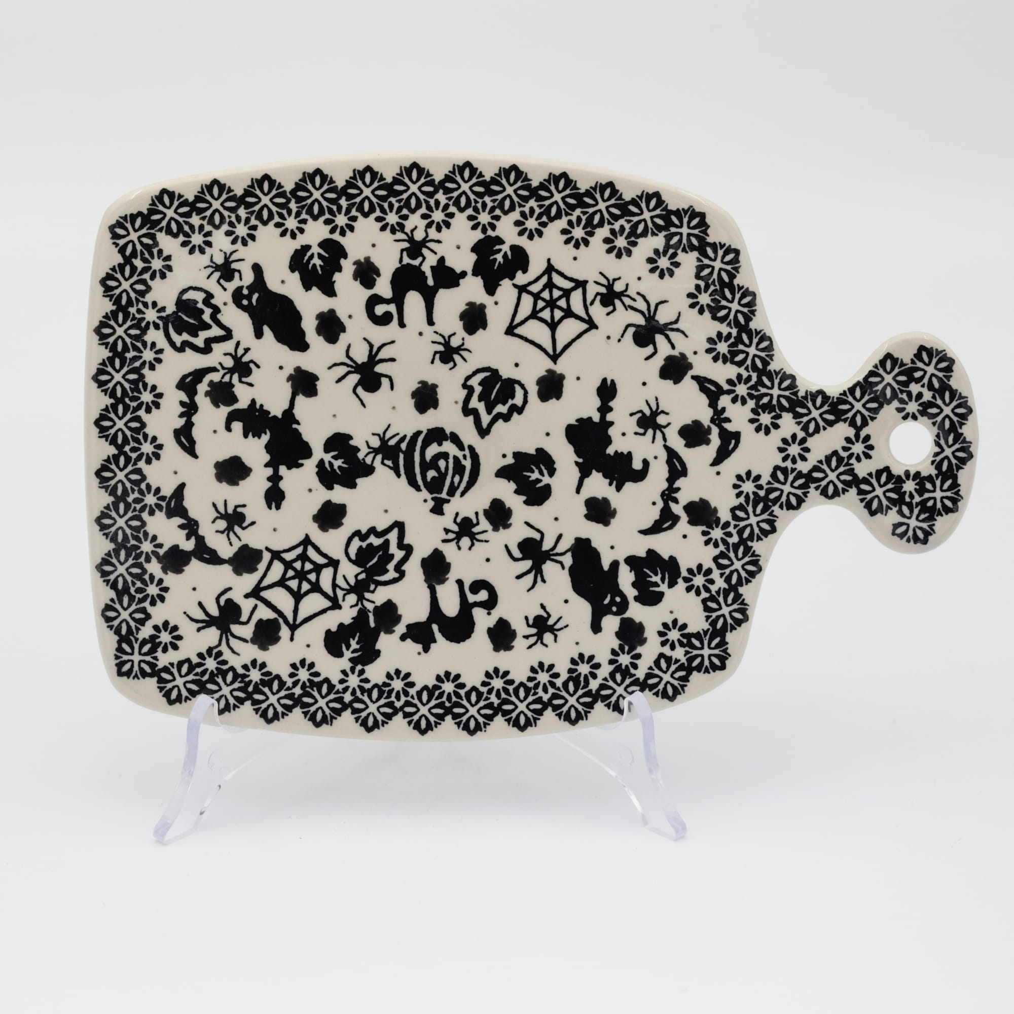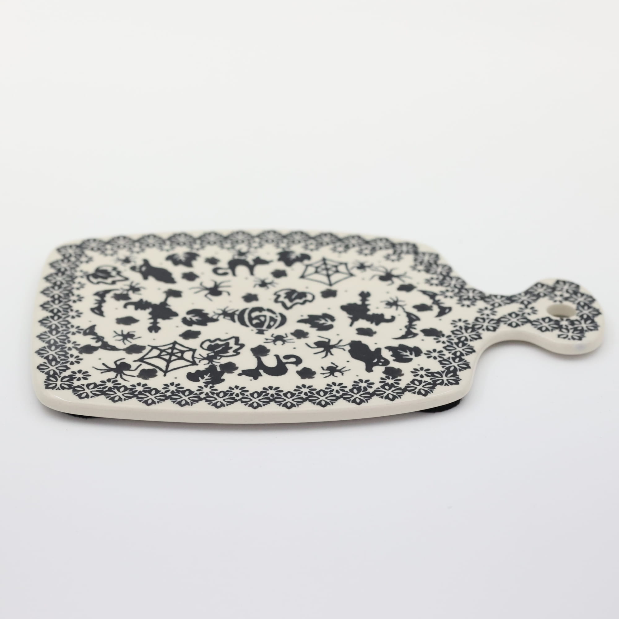 Rewelacyjnie prezentuje się jako dekoracja ściany, pozwalają na to śliczne wzory kwiatowe czy zdobiny tradycyjne, stempelkowe charakterystyczne dla ceramiki kamionkowej z Bolesławca. Wielkość deski pozwala do wykorzystania jej jako podkładkę pod gorące patelnie, garnki czy naczynia do zapiekania ceramiczne bądź klasyczne żaroodporne i metalowe, których każda gospodyni czy kucharz w swoich szafkach kuchennych posiadają tuziny.