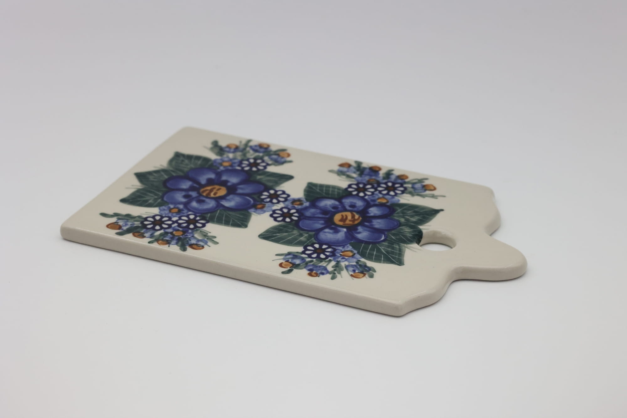 Rewelacyjnie prezentuje się jako dekoracja ściany, pozwalają na to śliczne wzory kwiatowe czy zdobiny tradycyjne, stempelkowe charakterystyczne dla ceramiki kamionkowej z Bolesławca. Wielkość deski pozwala do wykorzystania jej jako podkładkę pod gorące patelnie, garnki czy naczynia do zapiekania ceramiczne bądź klasyczne żaroodporne i metalowe, których każda gospodyni czy kucharz w swoich szafkach kuchennych posiadają tuziny.