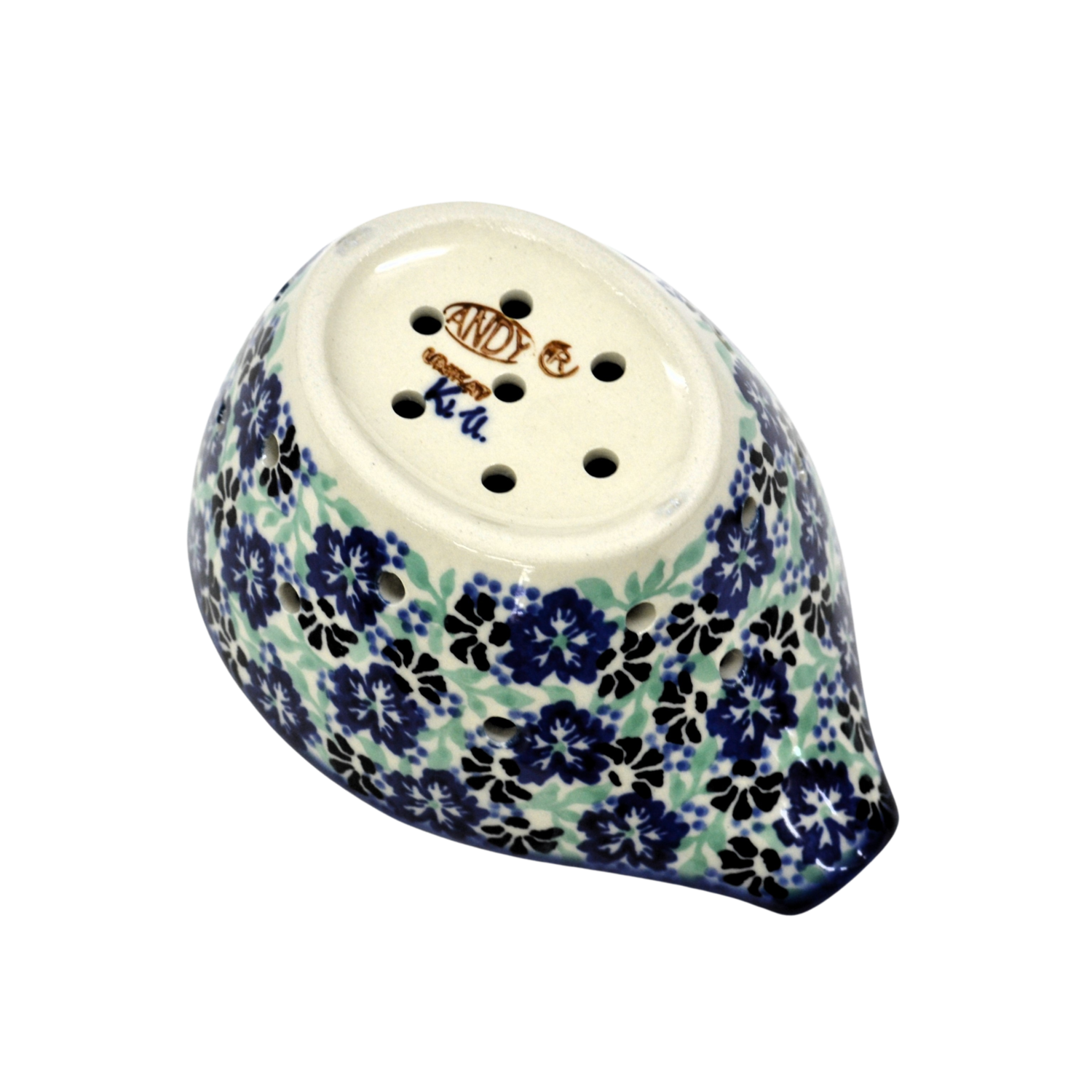Ręcznie zdobiony w tradycyjne, podszkliwne zdobienia charakterystyczne dla ceramiki artystycznej z Bolesławca.