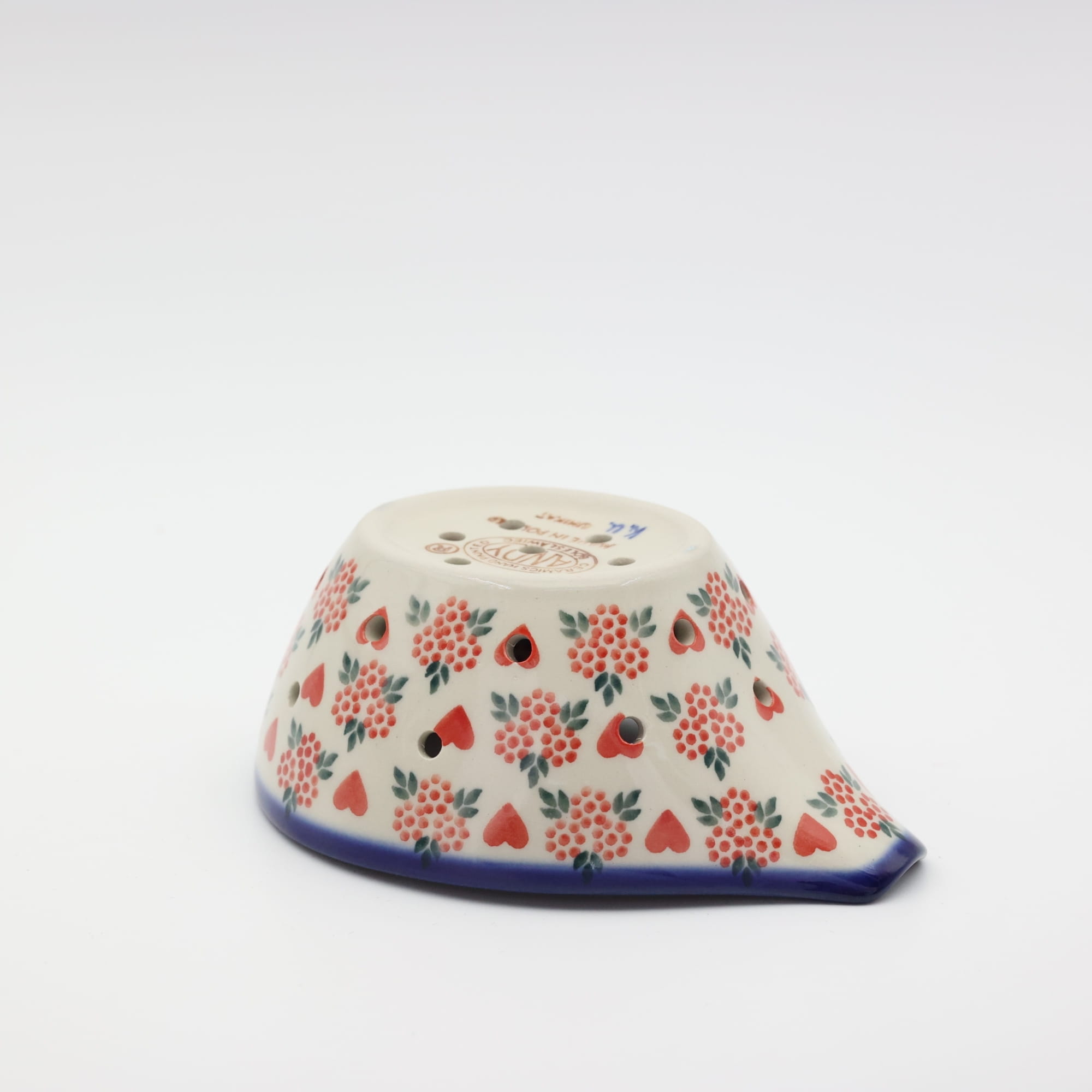 Ręcznie zdobiony w tradycyjne, podszkliwne zdobienia charakterystyczne dla ceramiki artystycznej z Bolesławca.