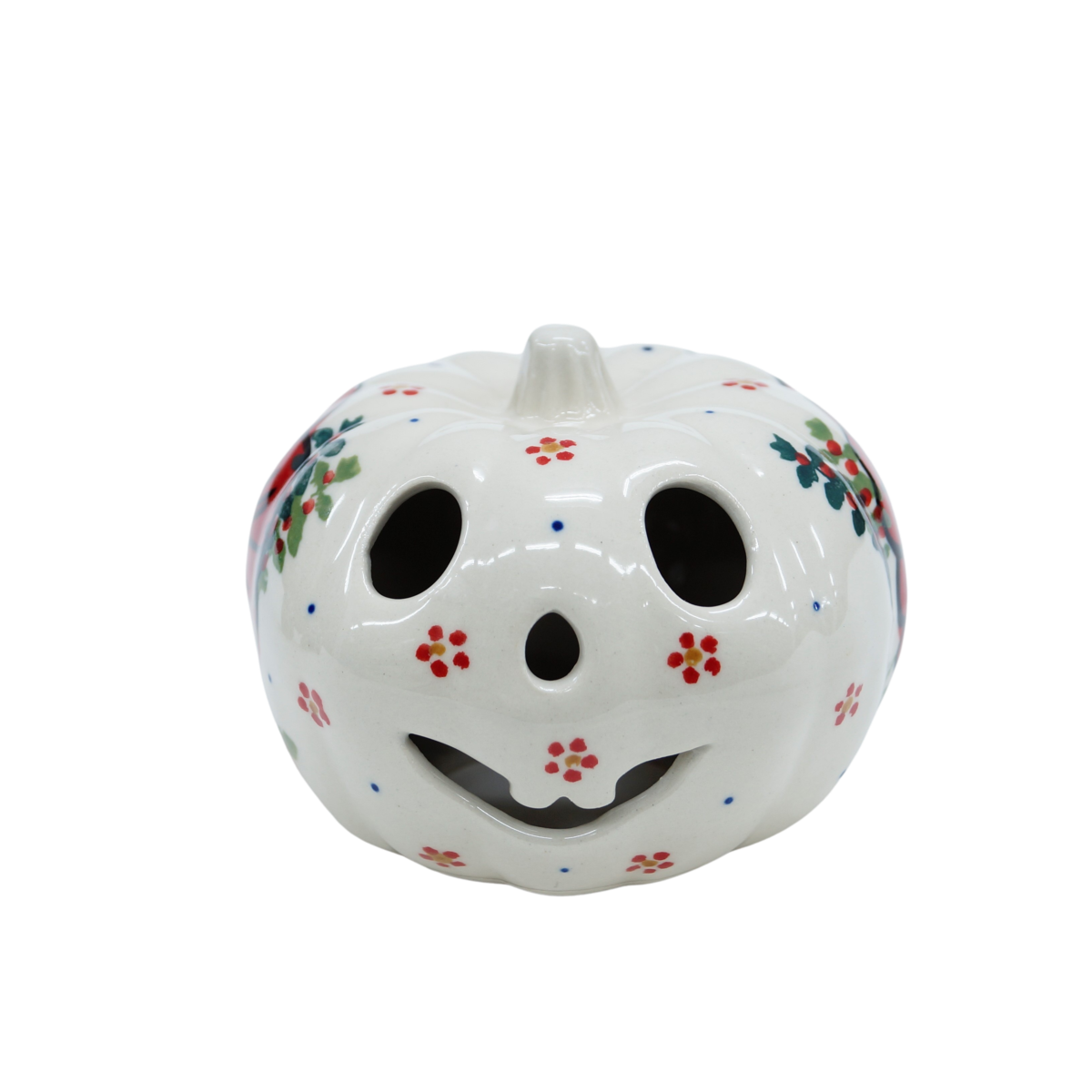Ozdobna dynia ceramiczna o imieniu Baby Boo (lampion ceramiczny), ręcznie malowana ceramika bolesławiecka to doskonały element dekoracyjny do każdego ogrodu, tarasu lub wnętrza Twojego domu, podczas celebrowania Halloween bądź w okresie jesiennym, kiedy to liście lecą z drzew, roślinność obumiera a nasze śliczne ręcznie wykonane zdobienia ceramiki artystycznej nadają charakteru wystroju Twojego domu.