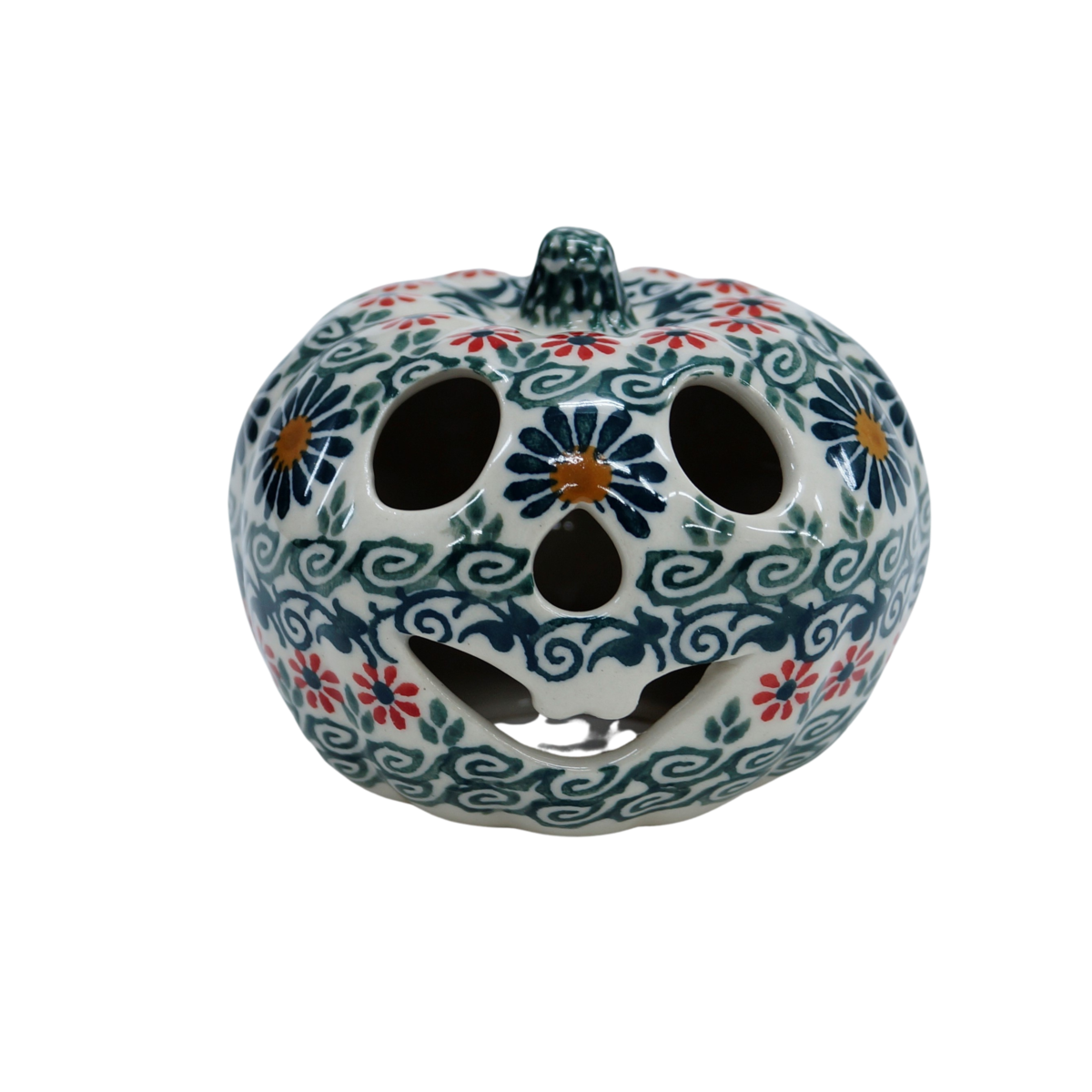 Ozdobna dynia ceramiczna o imieniu Baby Boo (lampion ceramiczny), ręcznie malowana ceramika bolesławiecka to doskonały element dekoracyjny do każdego ogrodu, tarasu lub wnętrza Twojego domu, podczas celebrowania Halloween bądź w okresie jesiennym, kiedy to liście lecą z drzew, roślinność obumiera a nasze śliczne ręcznie wykonane zdobienia ceramiki artystycznej nadają charakteru wystroju Twojego domu.