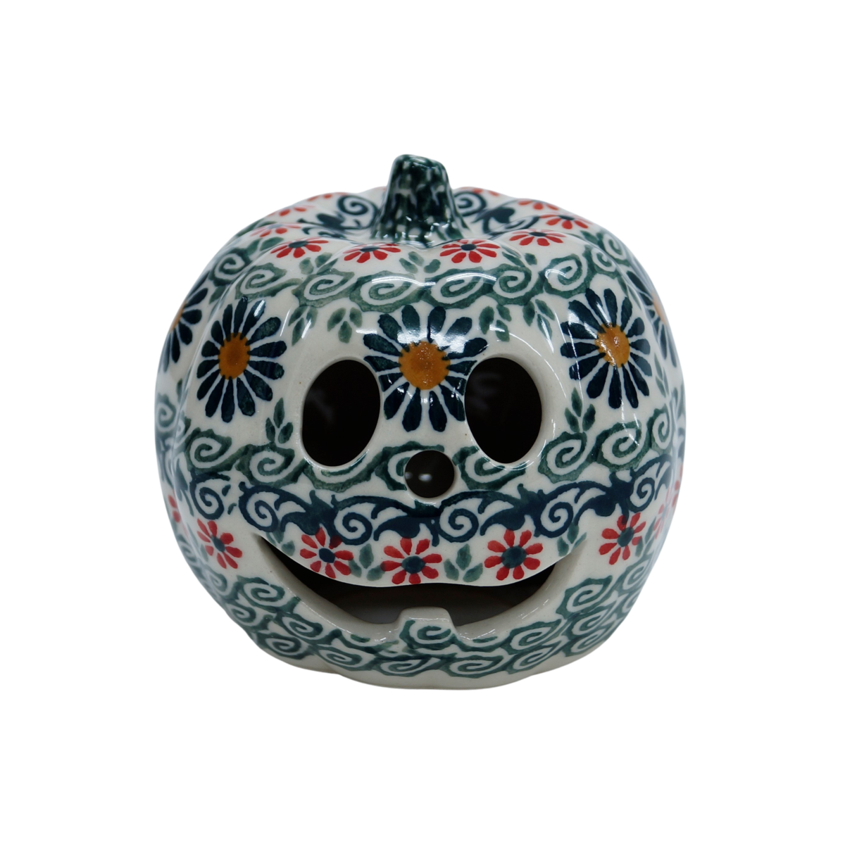 Ozdobna dynia ceramiczna o imieniu Jack (lampion ceramiczny), ręcznie malowana ceramika bolesławiecka to doskonały element dekoracyjny do każdego ogrodu, tarasu lub wnętrza Twojego domu, podczas celebrowania Halloween bądź w okresie jesiennym, kiedy to liście lecą z drzew, roślinność obumiera a nasze śliczne ręcznie wykonane zdobienia ceramiki artystycznej nadają charakteru wystroju Twojego domu.