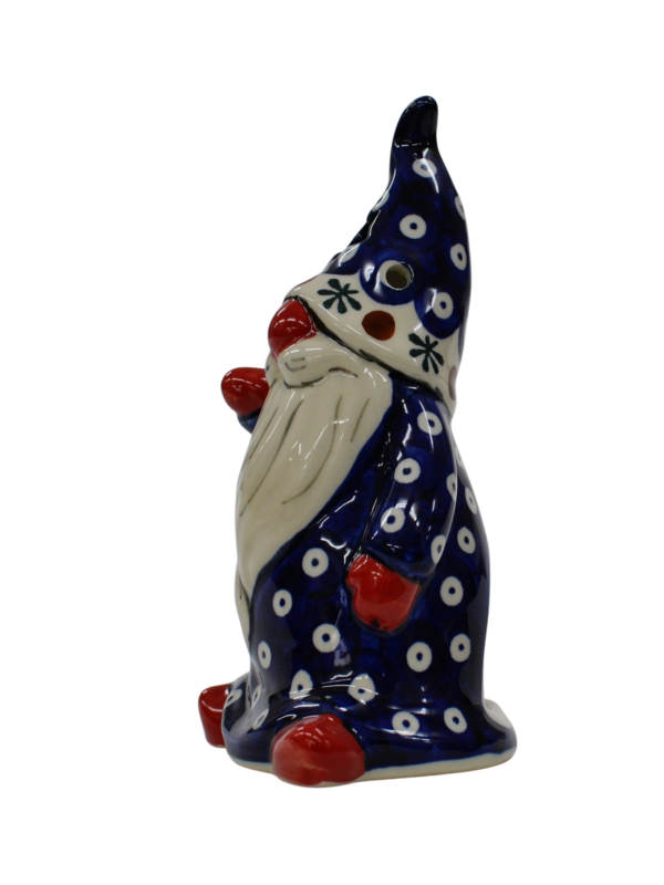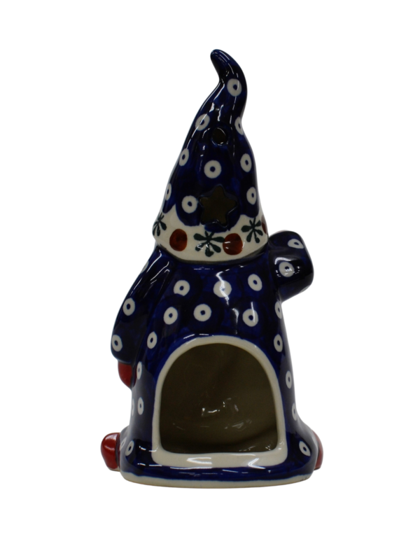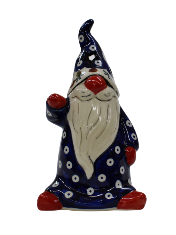 Pięknie, ręcznie dekorowany podszkliwnie Skrzat, o imieniu ANDY. Gnom okryty czapką, która okrywa jego twarz podkreślając zmarznięty w mroźny poranek czerwony nos. Wycięte w czapce gwiazdki i okrągłe otwory będą rozświetlać każde pomieszczenie dzięki świeczce (żarówce LED), którą możesz umieścić wewnątrz skrzata, dzięki otworowi do umieszczenia świeczki.