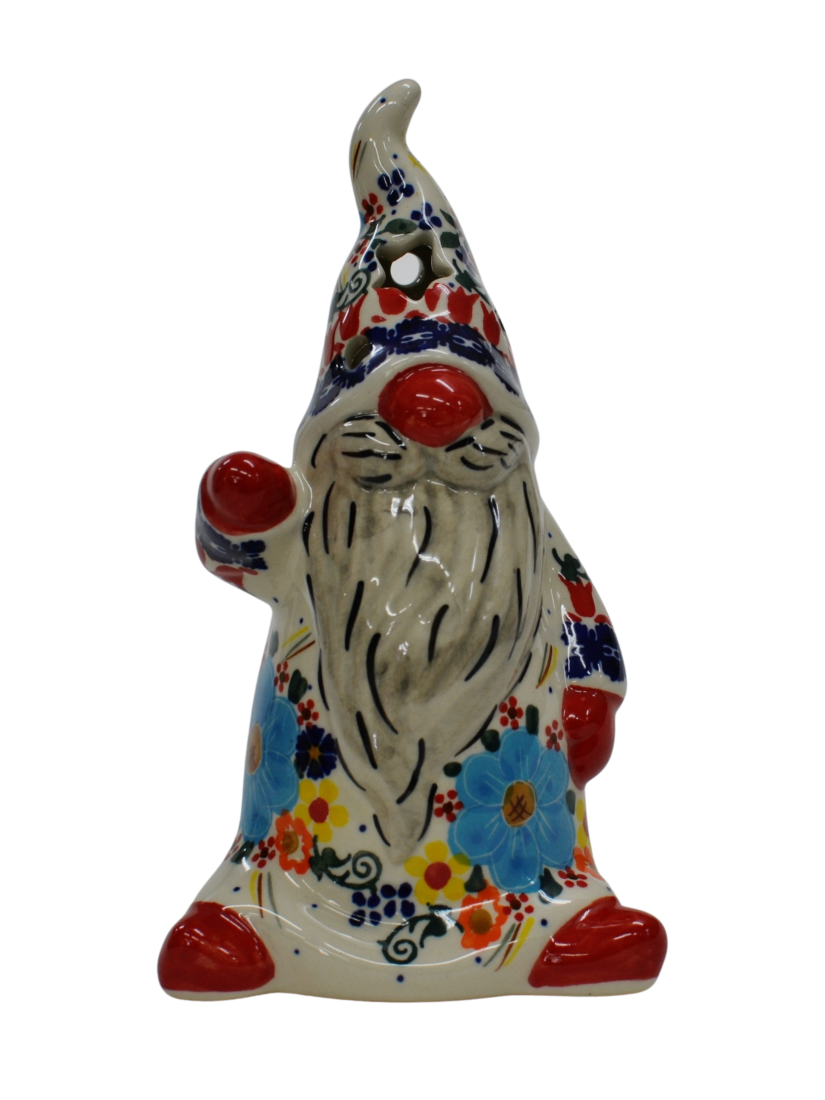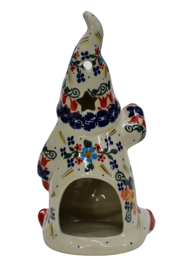 Pięknie, ręcznie dekorowany podszkliwnie Skrzat, o imieniu ANDY. Gnom okryty czapką, która okrywa jego twarz podkreślając zmarznięty w mroźny poranek czerwony nos. Wycięte w czapce gwiazdki i okrągłe otwory będą rozświetlać każde pomieszczenie dzięki świeczce (żarówce LED), którą możesz umieścić wewnątrz skrzata, dzięki otworowi do umieszczenia świeczki.