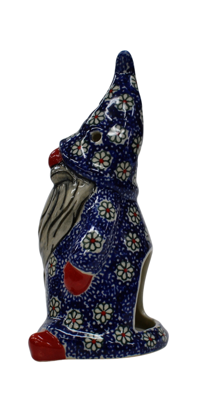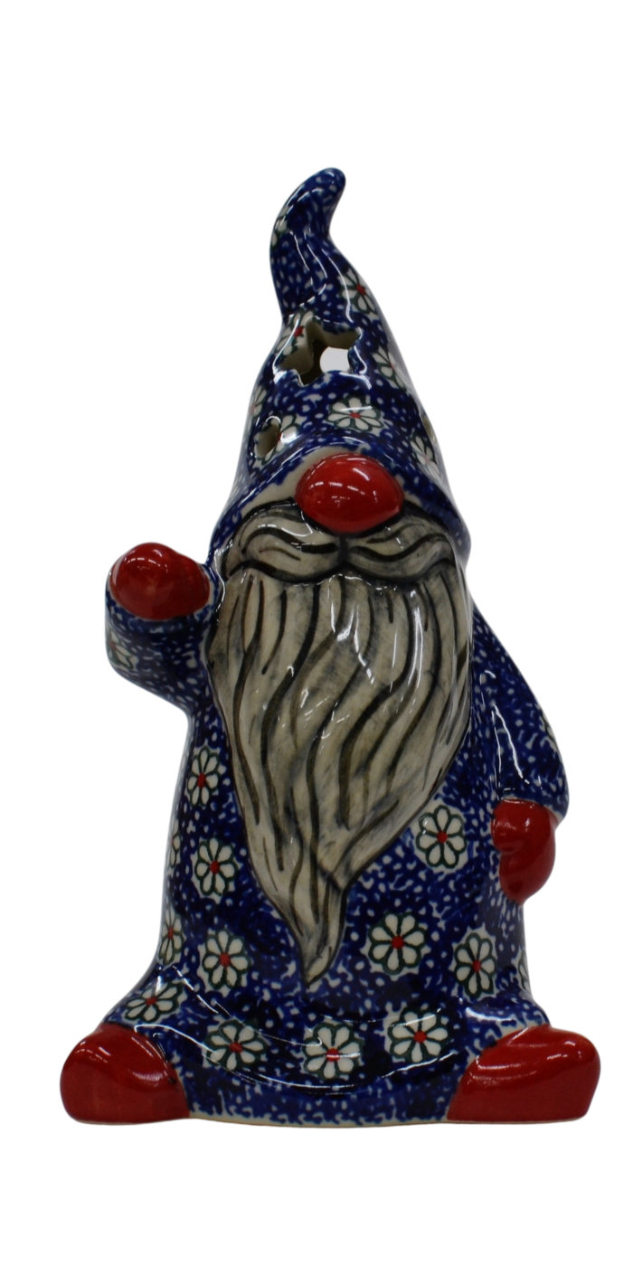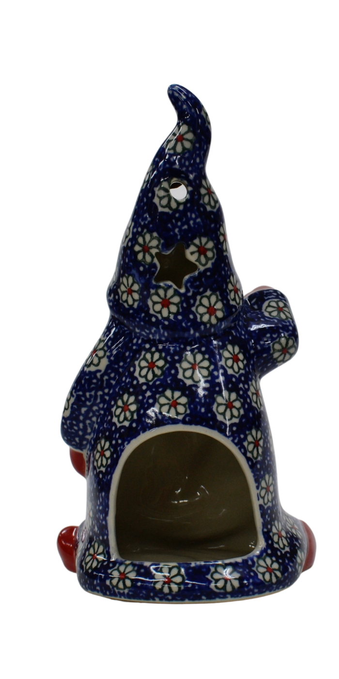 Pięknie, ręcznie dekorowany podszkliwnie Skrzat, o imieniu ANDY. Gnom okryty czapką, która okrywa jego twarz podkreślając zmarznięty w mroźny poranek czerwony nos. Wycięte w czapce gwiazdki i okrągłe otwory będą rozświetlać każde pomieszczenie dzięki świeczce (żarówce LED), którą możesz umieścić wewnątrz skrzata, dzięki otworowi do umieszczenia świeczki.
