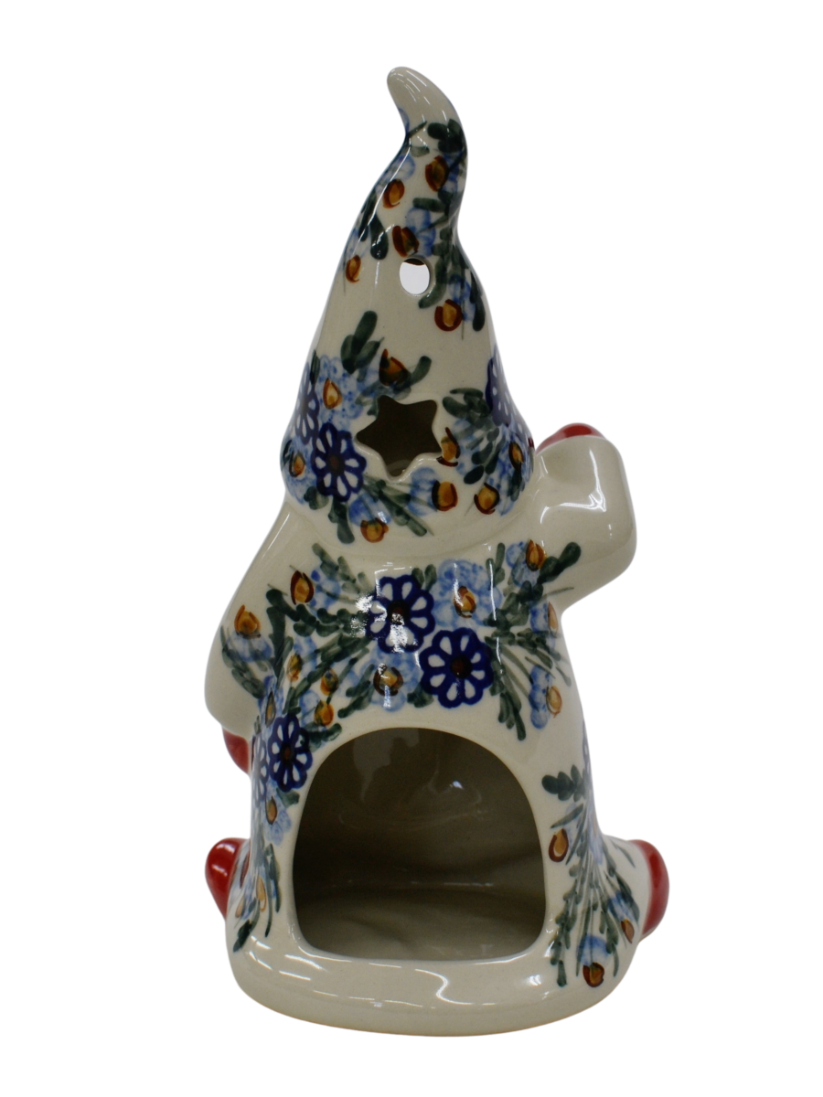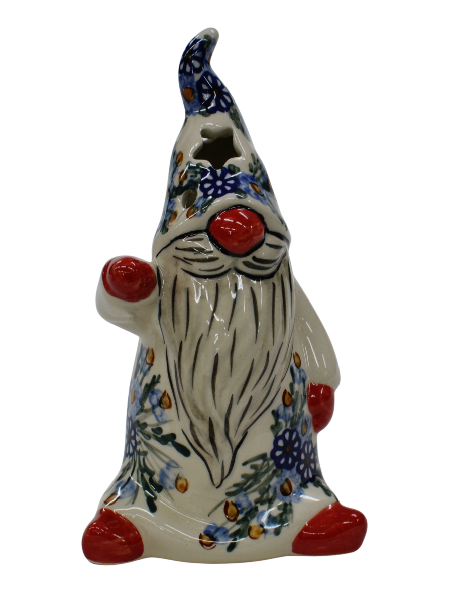 Pięknie, ręcznie dekorowany podszkliwnie Skrzat, o imieniu ANDY. Gnom okryty czapką, która okrywa jego twarz podkreślając zmarznięty w mroźny poranek czerwony nos. Wycięte w czapce gwiazdki i okrągłe otwory będą rozświetlać każde pomieszczenie dzięki świeczce (żarówce LED), którą możesz umieścić wewnątrz skrzata, dzięki otworowi do umieszczenia świeczki.