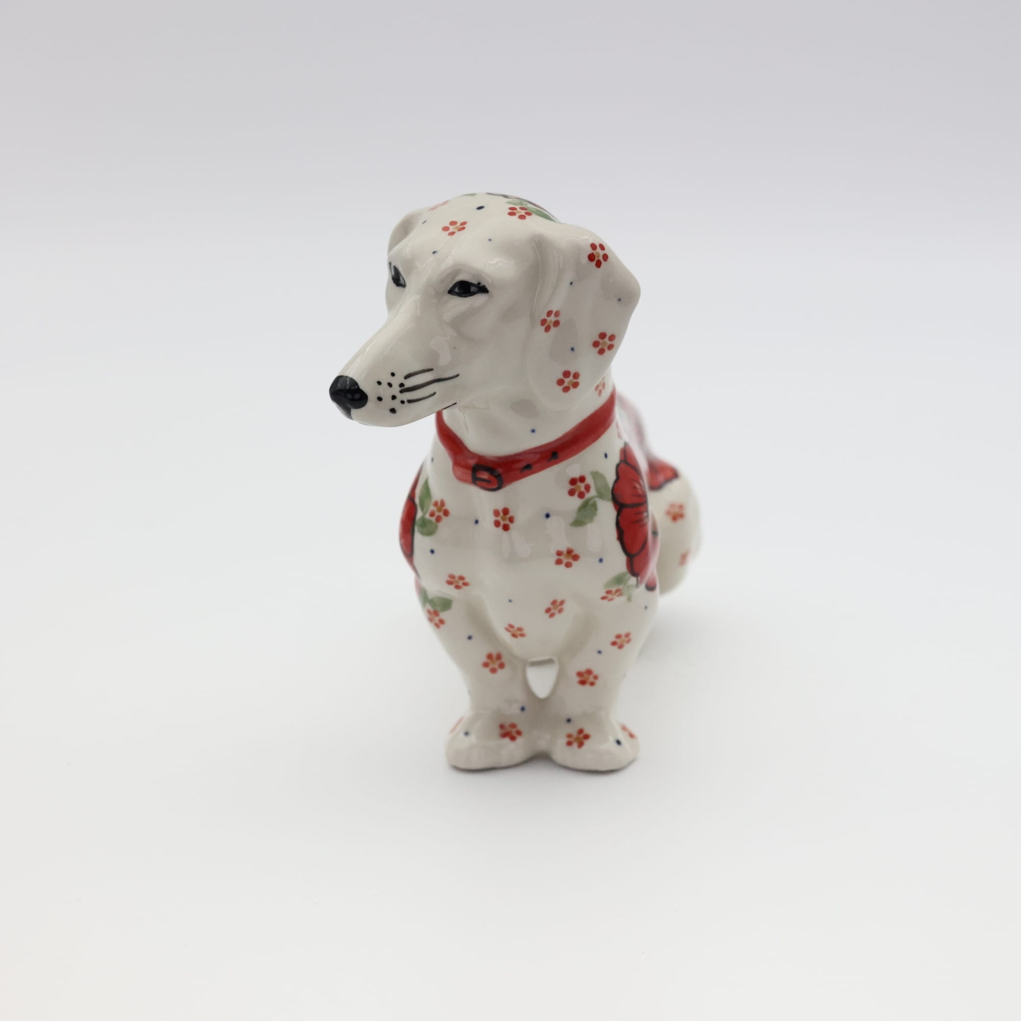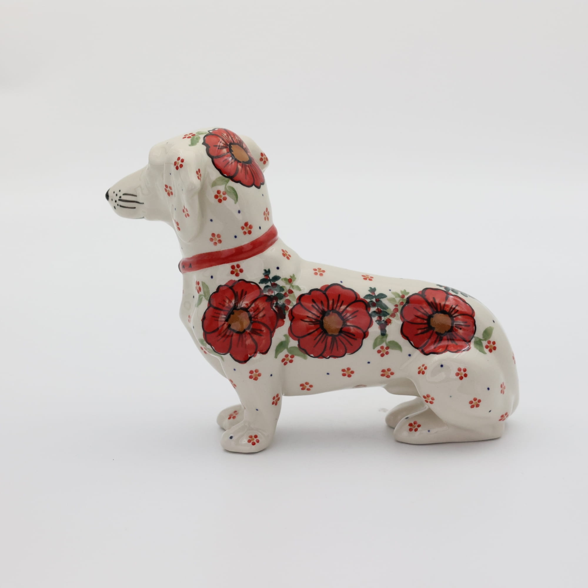 Figurka psa jamnika o długości aż 25 cm, powstała z myślą o jamniku Kajtku, który przed laty każdego dnia witał klientów w naszej fabryce. Niestety odszedł już za tęczowy most i został wspomnieniem i inspiracją do stworzenia produktu dekoracyjnego.