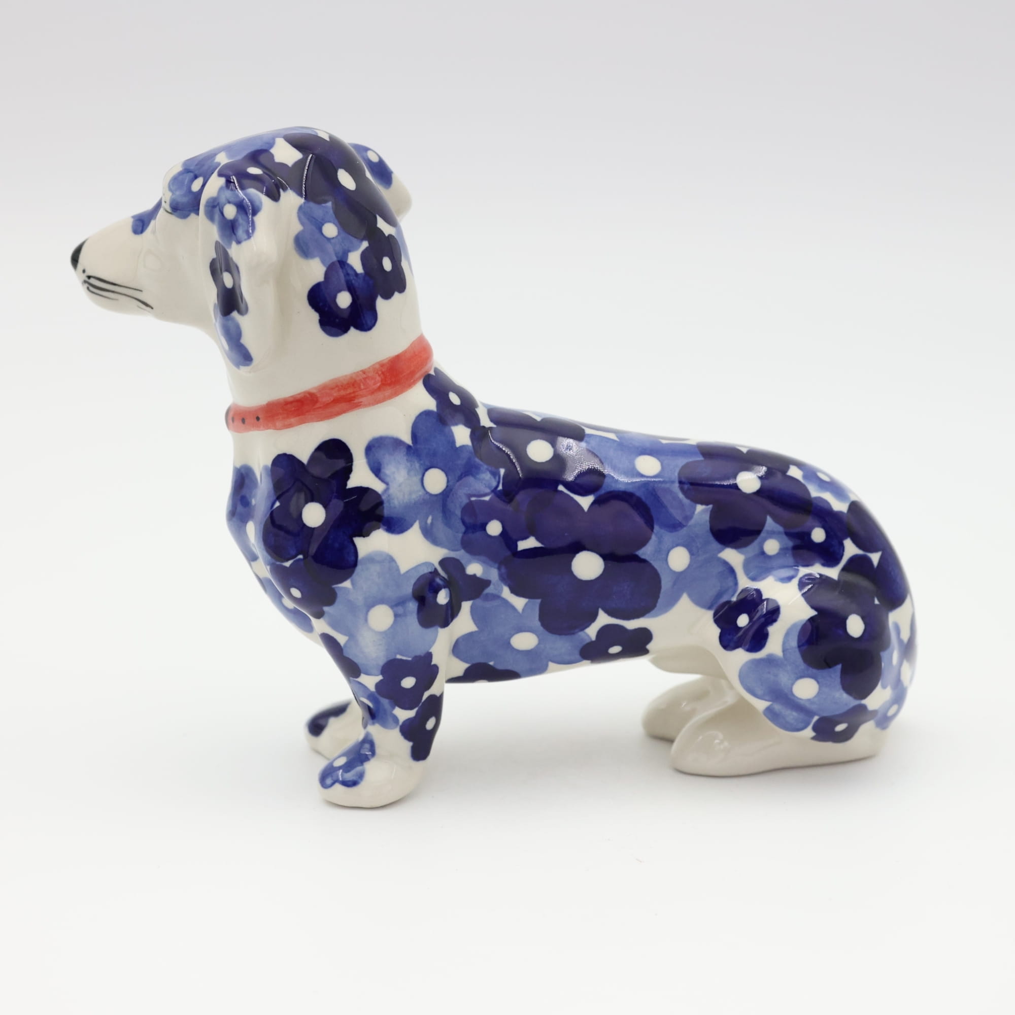 Figurka psa jamnika o długości aż 25 cm, powstała z myślą o jamniku Kajtku, który przed laty każdego dnia witał klientów w naszej fabryce. Niestety odszedł już za tęczowy most i został wspomnieniem i inspiracją do stworzenia produktu dekoracyjnego.