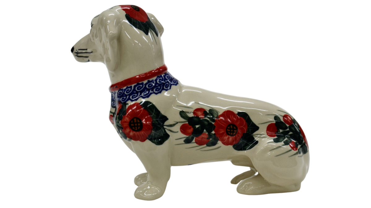 Figurka psa jamnika o długości aż 25 cm, powstała z myślą o jamniku Kajtku, który przed laty każdego dnia witał klientów w naszej fabryce. Niestety odszedł już za tęczowy most i został wspomnieniem i inspiracją do stworzenia produktu dekoracyjnego.