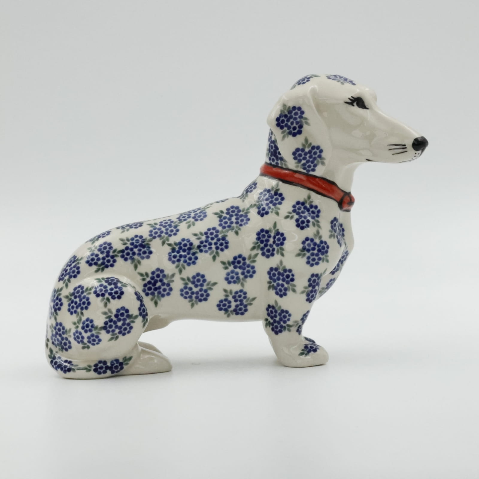 Figurka psa jamnika o długości aż 25 cm, powstała z myślą o jamniku Kajtku, który przed laty każdego dnia witał klientów w naszej fabryce. Niestety odszedł już za tęczowy most i został wspomnieniem i inspiracją do stworzenia produktu dekoracyjnego.