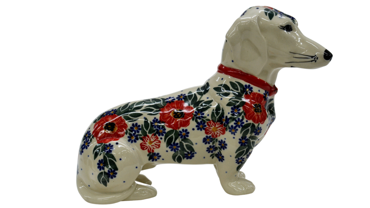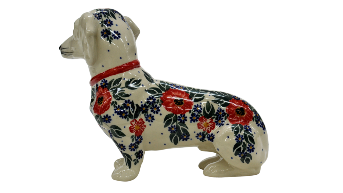Figurka psa jamnika o długości aż 25 cm, powstała z myślą o jamniku Kajtku, który przed laty każdego dnia witał klientów w naszej fabryce. Niestety odszedł już za tęczowy most i został wspomnieniem i inspiracją do stworzenia produktu dekoracyjnego.