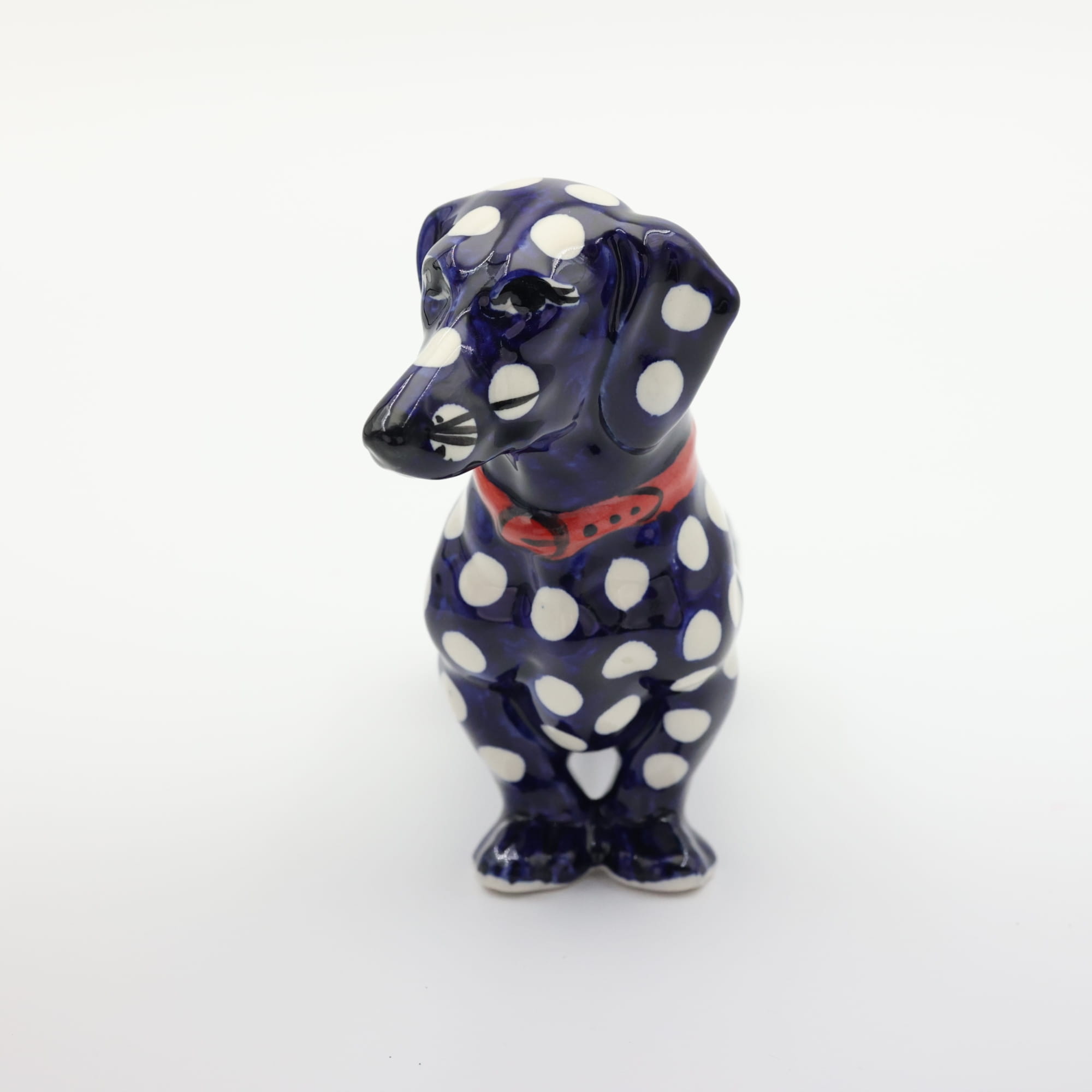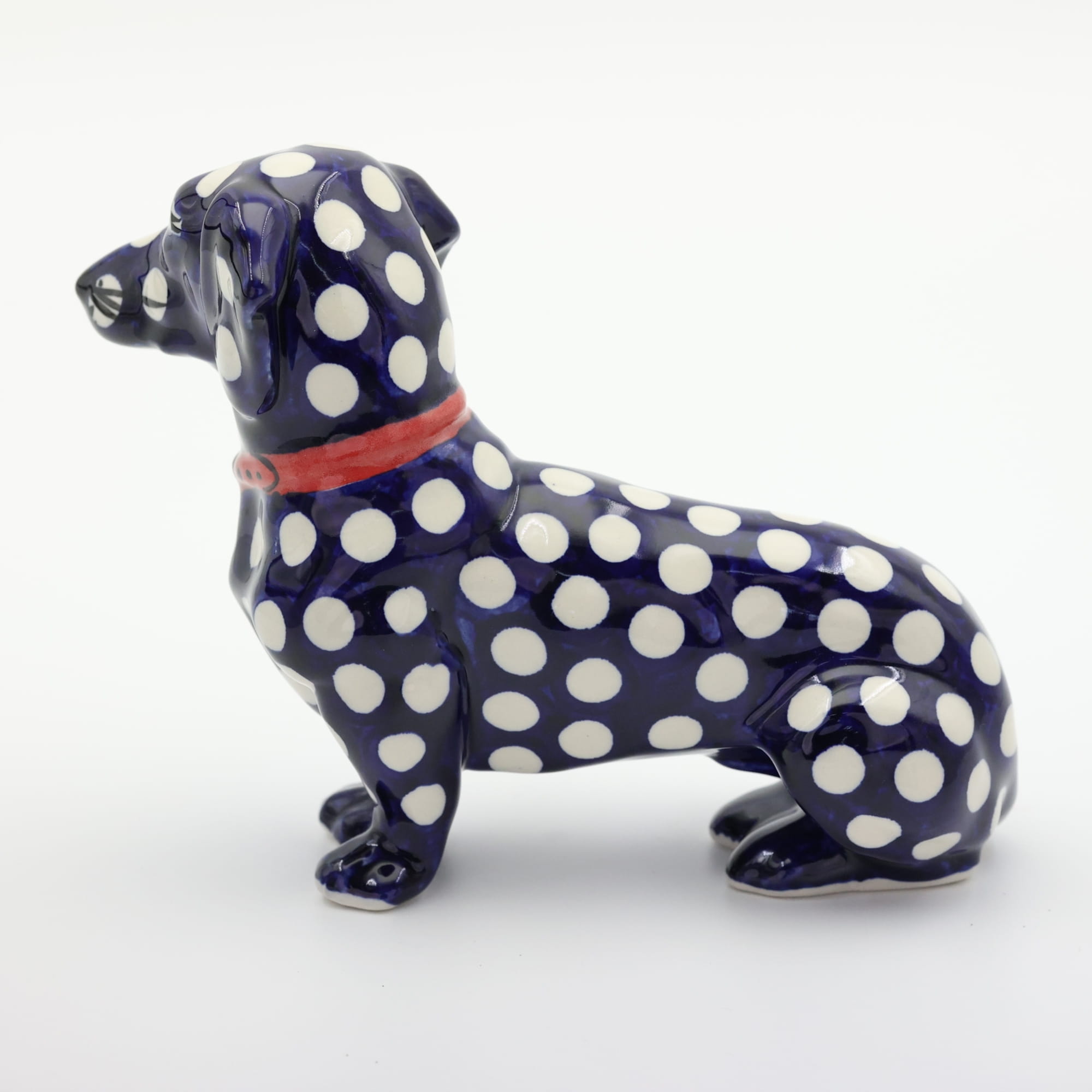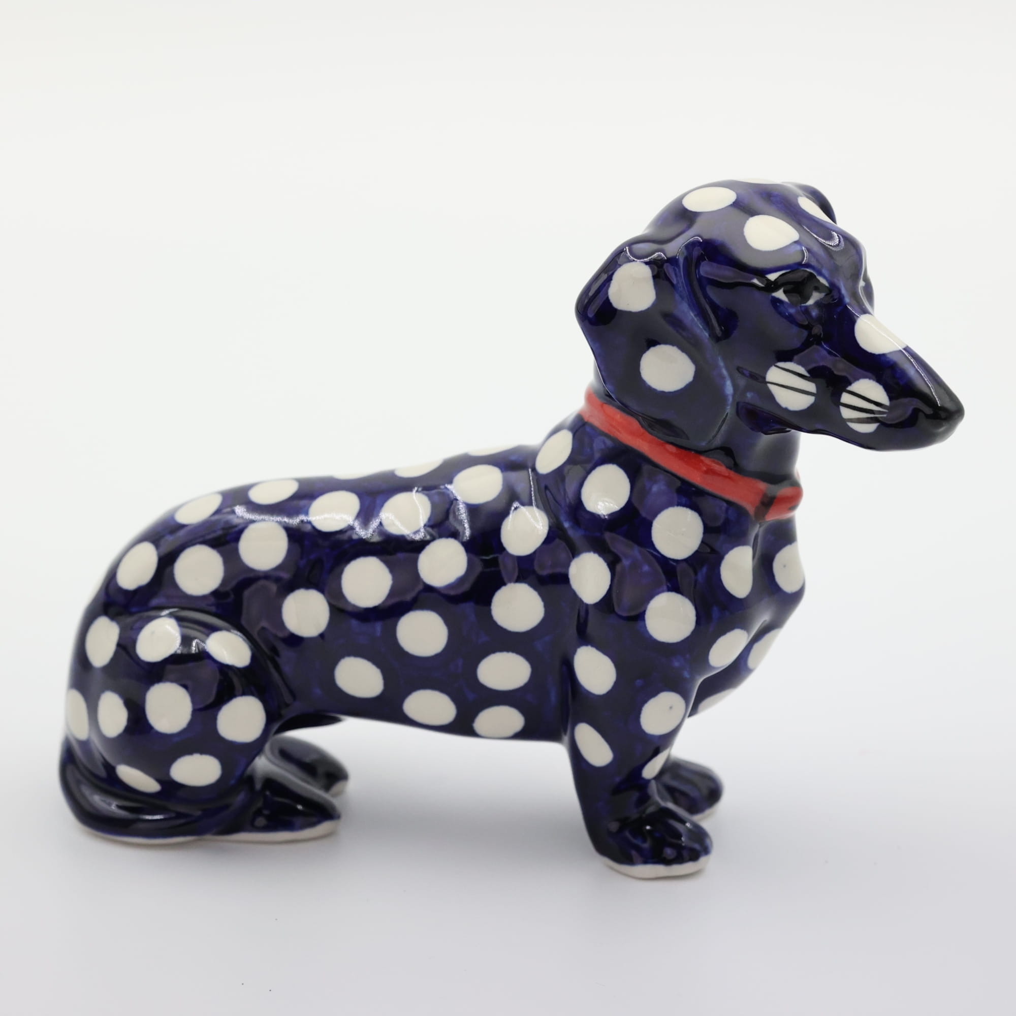 Figurka psa jamnika o długości aż 25 cm, powstała z myślą o jamniku Kajtku, który przed laty każdego dnia witał klientów w naszej fabryce. Niestety odszedł już za tęczowy most i został wspomnieniem i inspiracją do stworzenia produktu dekoracyjnego.
