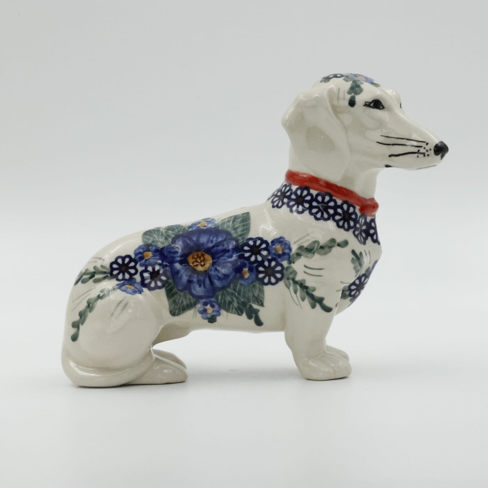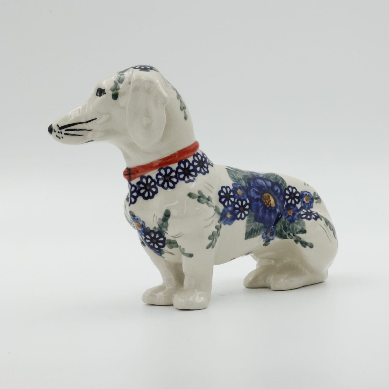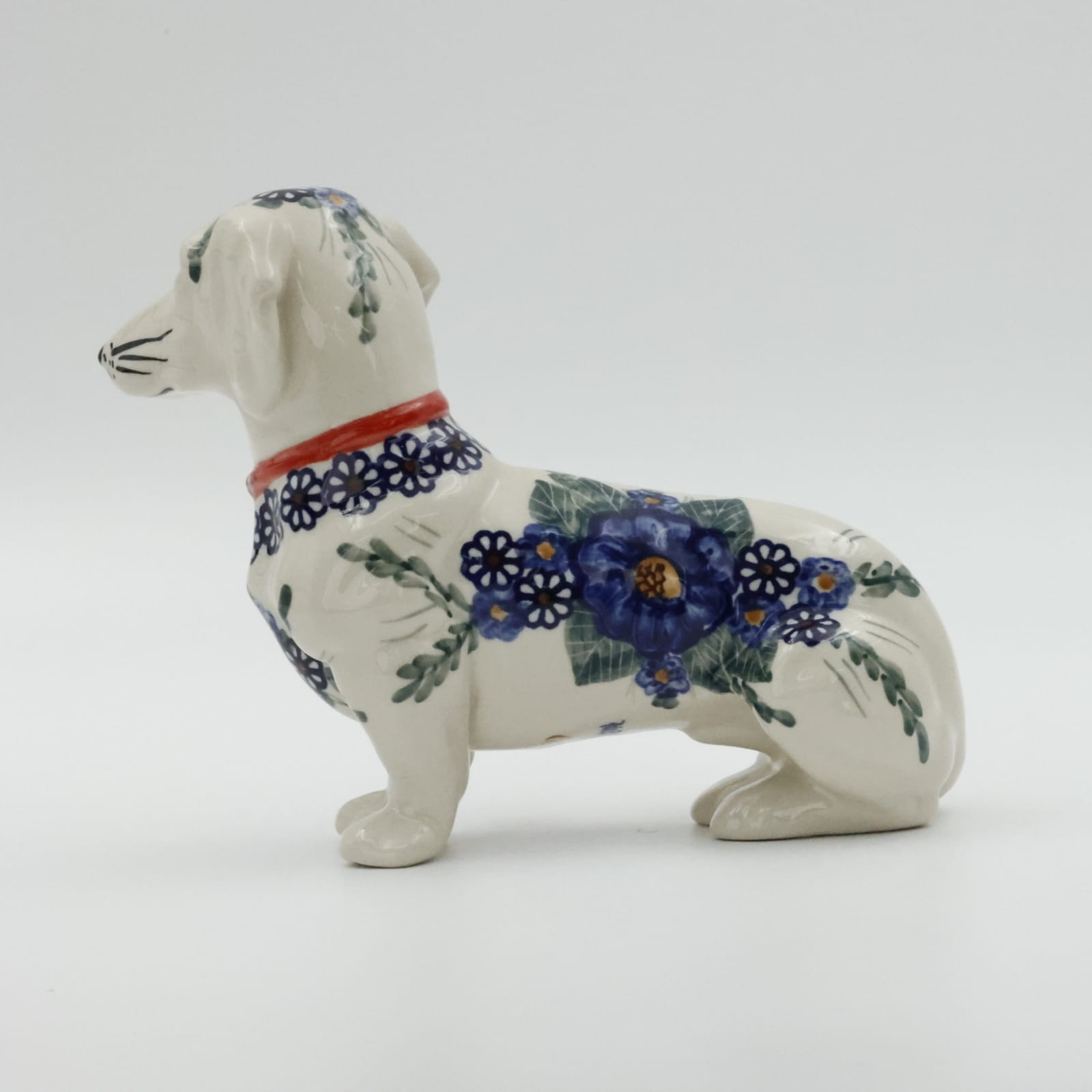 Figurka psa jamnika o długości aż 25 cm, powstała z myślą o jamniku Kajtku, który przed laty każdego dnia witał klientów w naszej fabryce. Niestety odszedł już za tęczowy most i został wspomnieniem i inspiracją do stworzenia produktu dekoracyjnego.