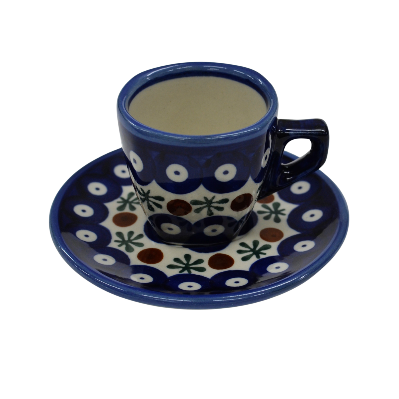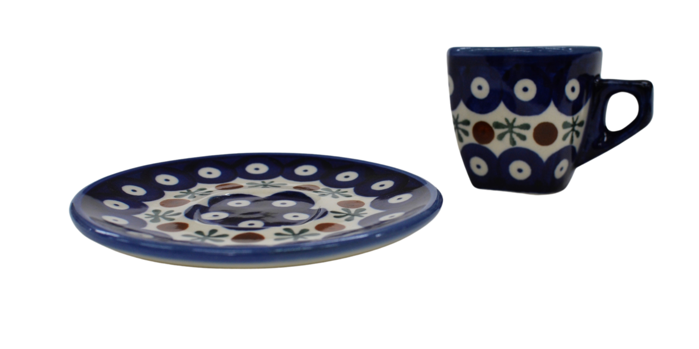Piękna ceramiczna filiżanka kwadratowa ze spodkiem do kawy Espresso o pojemności 70 ml, wyprodukowana w bolesławieckim zakładzie ceramiki artystycznej. Ręcznie zdobione naczynie ceramiczne w piękne wzory kamionki bolesławieckiej. Mocna kawa Espresso może zostać podana w tej filiżance podczas codziennego picia kawy bądź przyjęć.