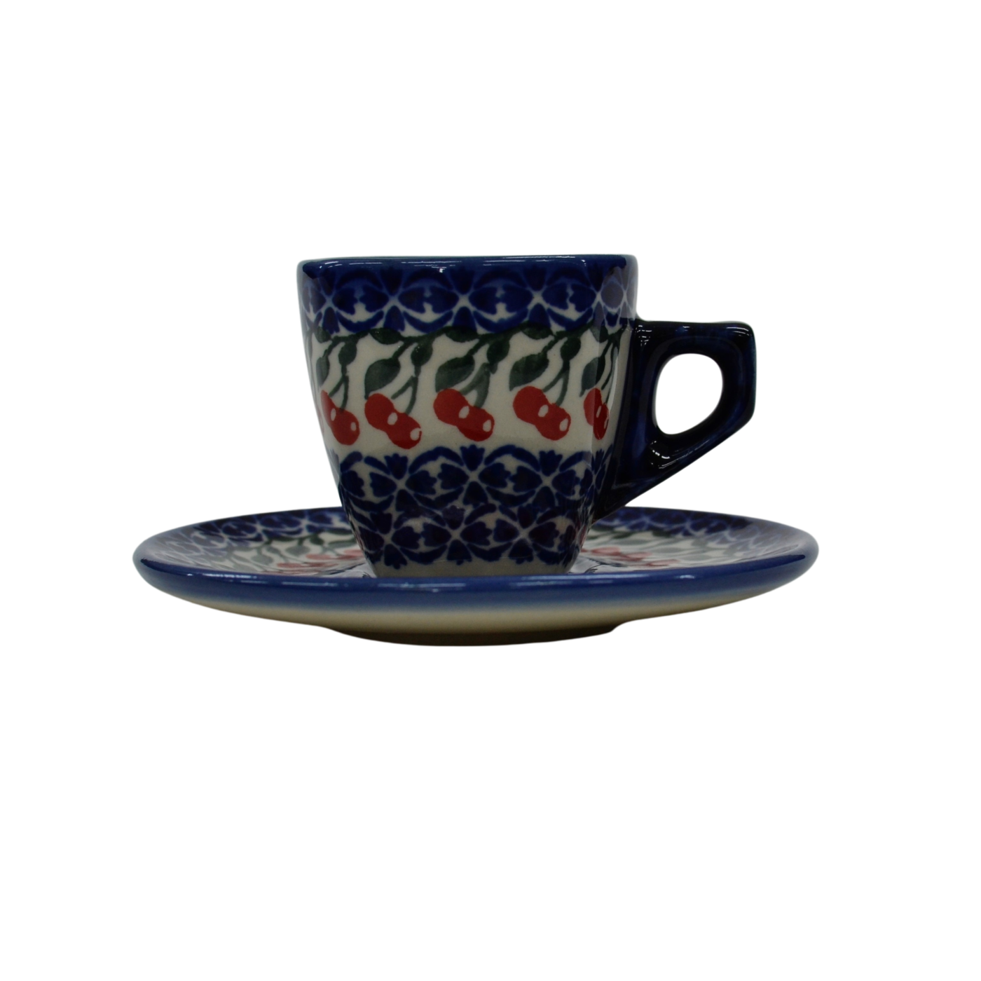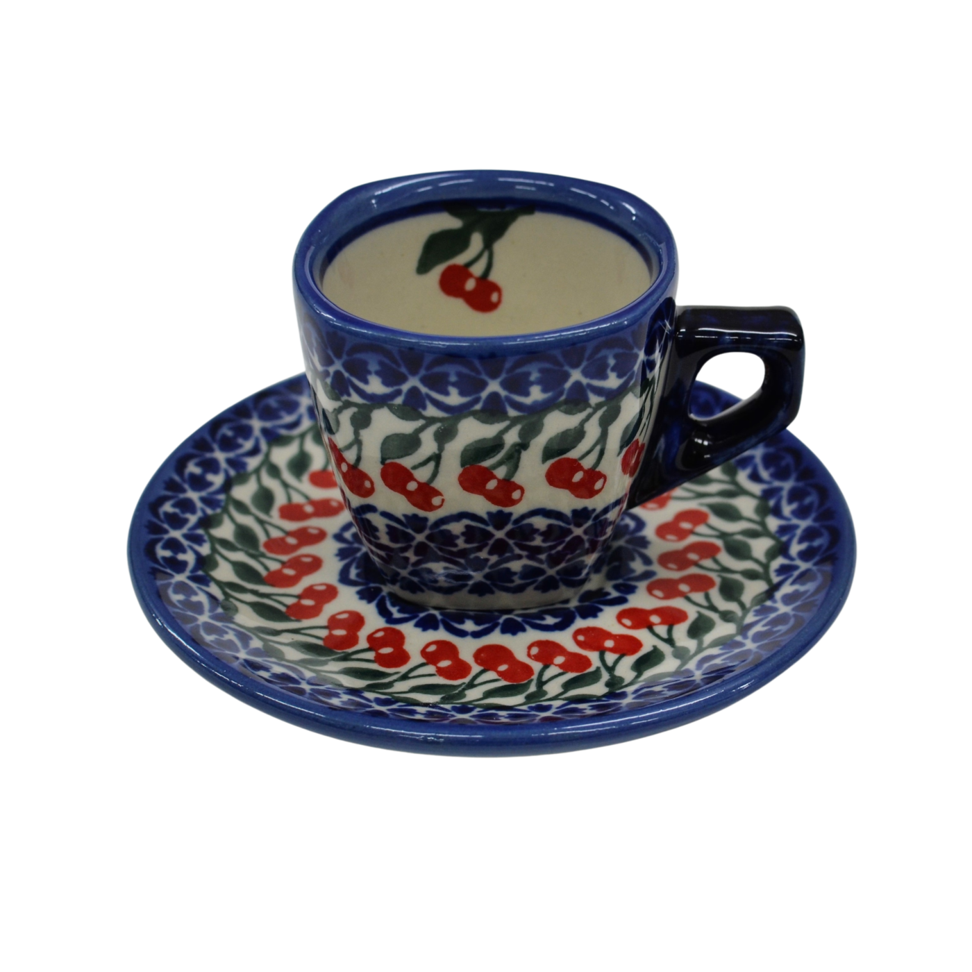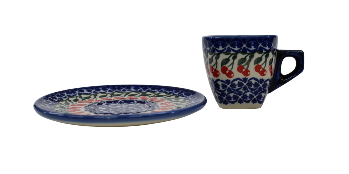 Piękna ceramiczna filiżanka kwadratowa ze spodkiem do kawy Espresso o pojemności 70 ml, wyprodukowana w bolesławieckim zakładzie ceramiki artystycznej. Ręcznie zdobione naczynie ceramiczne w piękne wzory kamionki bolesławieckiej. Mocna kawa Espresso może zostać podana w tej filiżance podczas codziennego picia kawy bądź przyjęć.