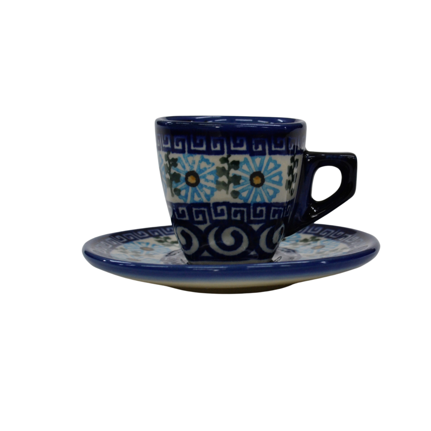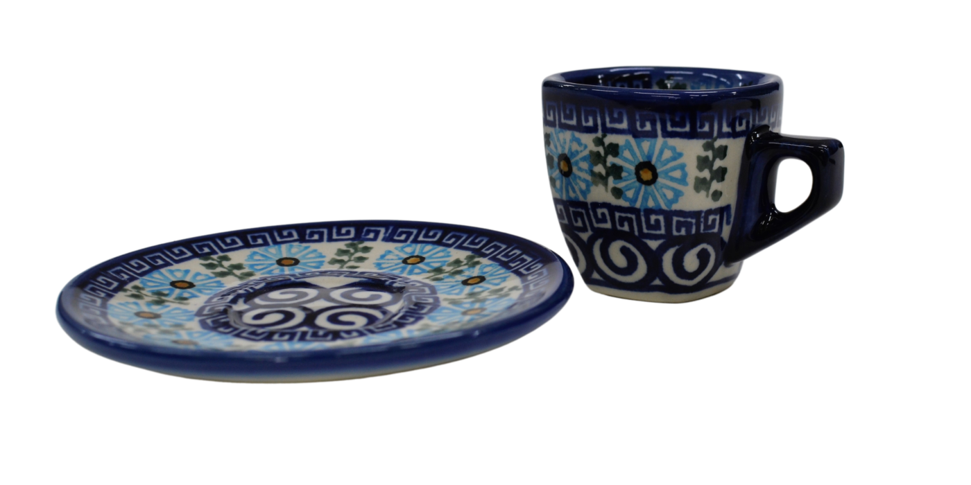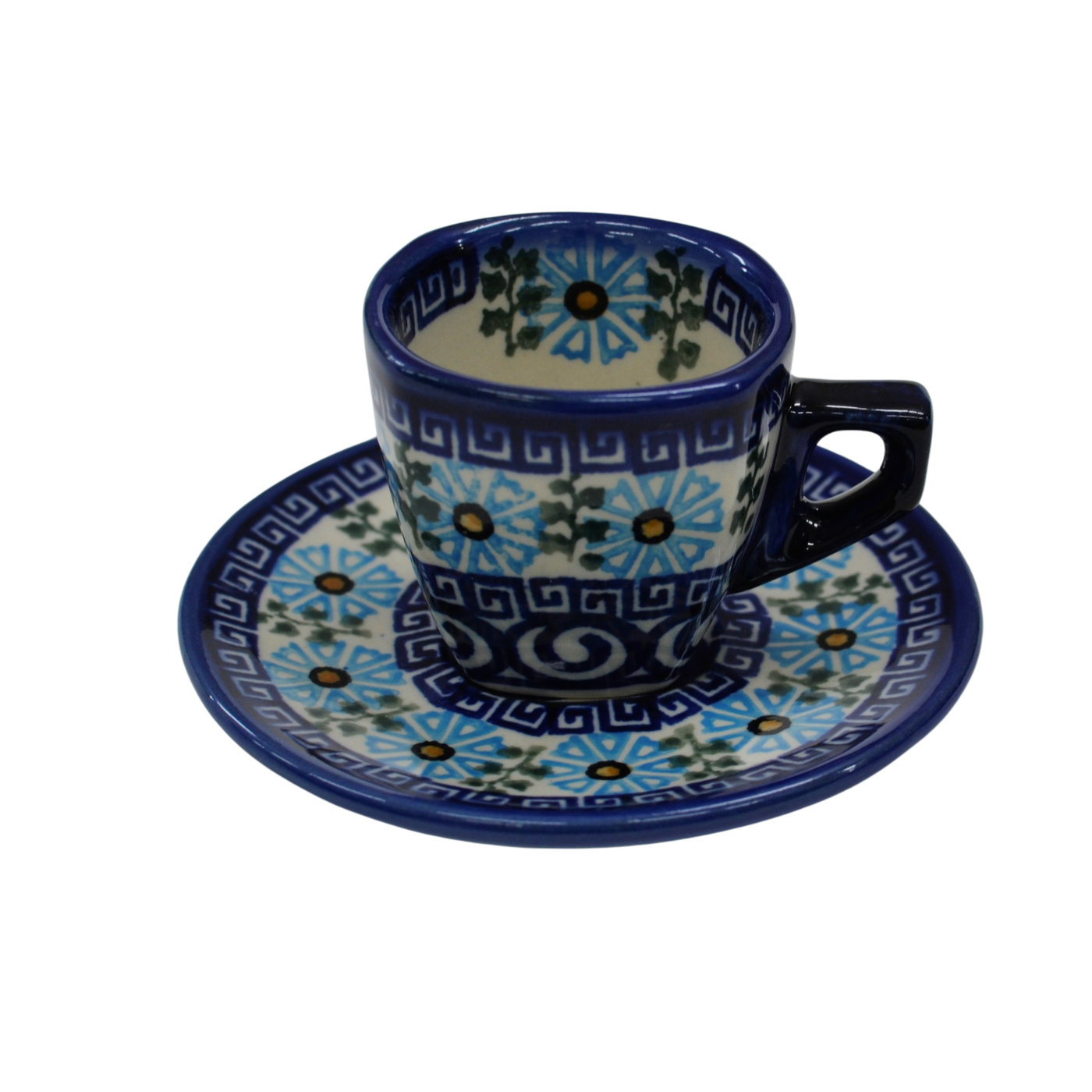 Piękna ceramiczna filiżanka kwadratowa ze spodkiem do kawy Espresso o pojemności 70 ml, wyprodukowana w bolesławieckim zakładzie ceramiki artystycznej. Ręcznie zdobione naczynie ceramiczne w piękne wzory kamionki bolesławieckiej. Mocna kawa Espresso może zostać podana w tej filiżance podczas codziennego picia kawy bądź przyjęć.